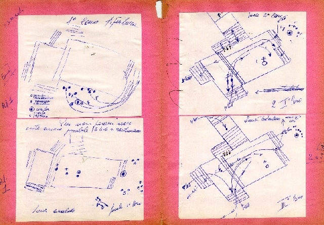 Schema dei movimenti di scena per l’opera Assassinio nella cattedrale di T.S. Eliot, rappresentata in piazza Vecchia a Bergamo, 26 agosto 1953