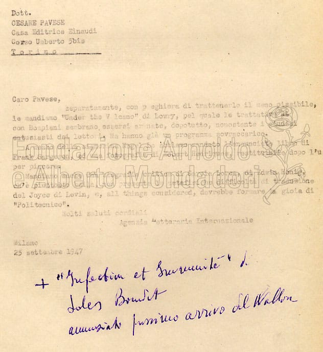 L’ordinamento prescelto riprende sostanzialmente la struttura originaria: ricondizionato interamente in oltre 38.000 fascicoli, l’archivio è organizzato in serie annuali al cui interno sono reperibili alfabeticamente i corrispondenti cosiddetti maggiori (Mondadori, Einaudi, Feltrinelli, Garzanti…) e i corrispondenti minori; le carte sono poi ordinate cronologicamente all’interno dei fascicoli.