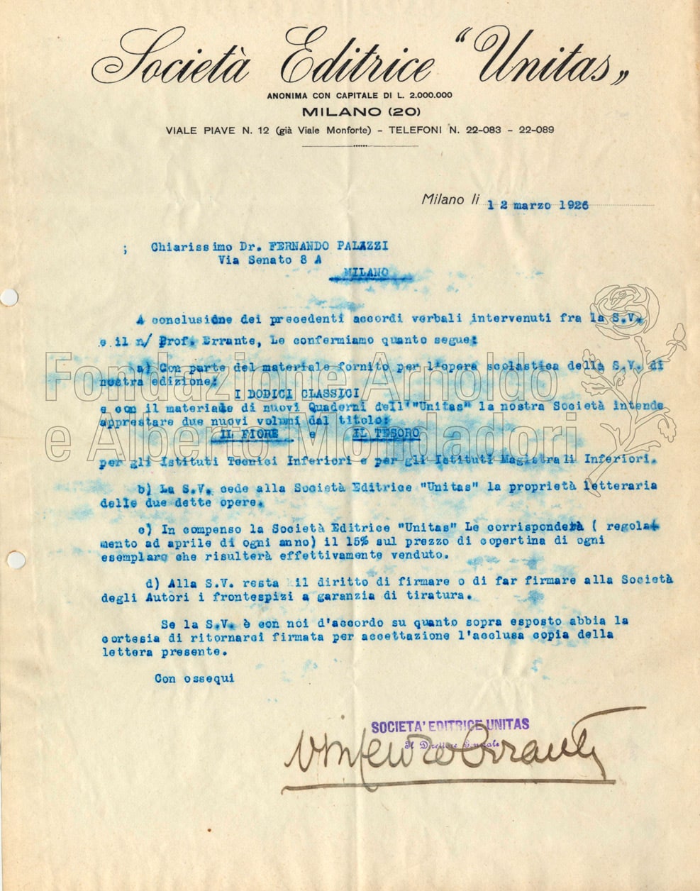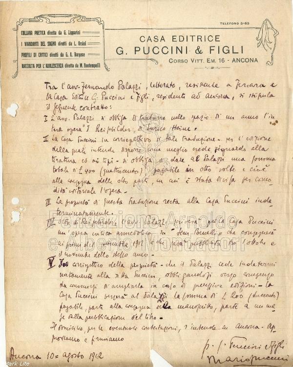 La serie è costituita da una busta che raccoglie 17 fascicoli intestati originariamente agli editori, in gran parte organizzati in sottofascicoli per «opera». Si tratta principalmente dei contratti relativi alle opere pubblicate, tradotte o dirette da Palazzi, e di corrispondenza con gli editori riguardante la gestione dei diritti. Come si desume dagli estremi cronologici (1912-1990), è presente documentazione successiva alla scomparsa del soggetto produttore.