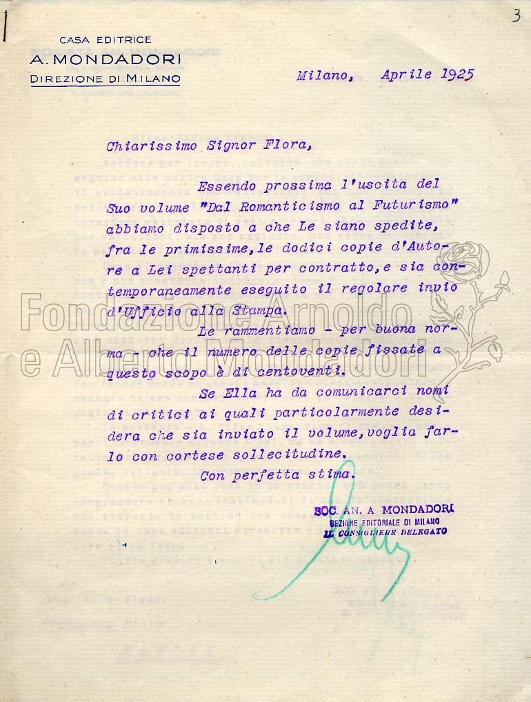 Si dà notizia in questa lettera dell’uscita del volume Dal Romanticismo al Futurismo, che fu pubblicato per la prima volta a Piacenza nel 1921 e con il quale Flora esordì come critico. L’opera venne ripubblicata da Mondadori nel 1925. Milano aprile 1925.