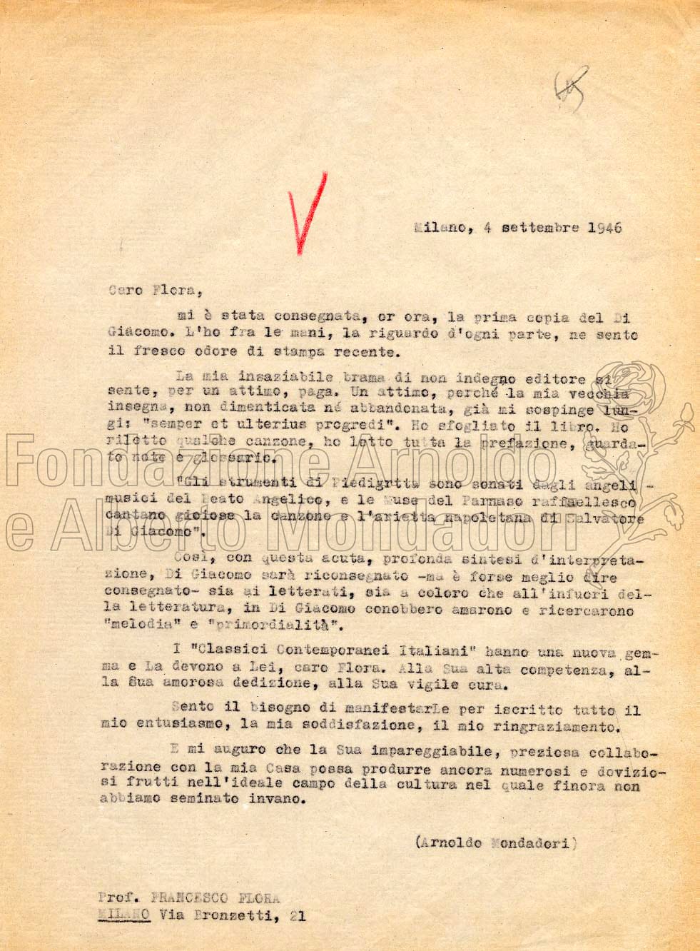 Arnoldo Mondadori invia a Flora i suoi più vivi ringraziamenti per aver curato l’opera di Salvatore Di Giacomo. Direttore dei “Classici italiani”, Flora prestava tuttavia la sua competenza anche per la curatela di volumi di altre collane, come i “Classici Contemporanei Italiani”, varati nel 1939. L’opera del Di Giacomo, cui Flora si dedicò insieme a Mario Vinciguerra, uscì in due volumi nel ’46 all’interno dei “Classici Contemporanei”. Milano 4 settembre 1946.