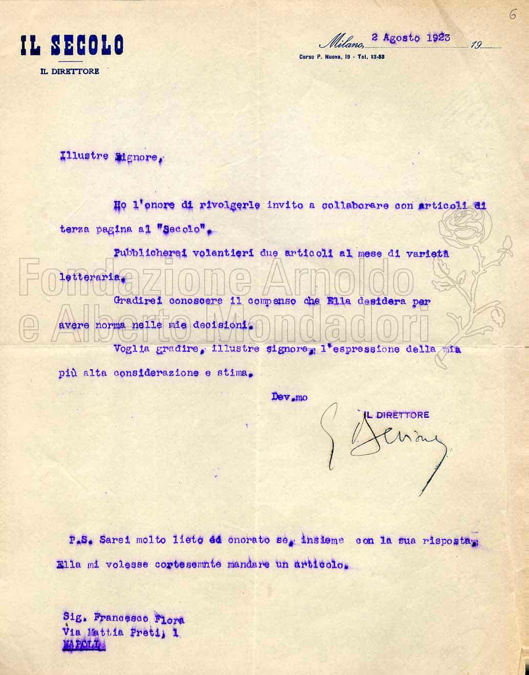 Con questa lettera viene proposta a Flora la collaborazione al “Secolo”, quotidiano acquisito da Mondadori nello stesso 1923 sotto la spinta di Senatore Borletti. Milano 2 agosto 1923.