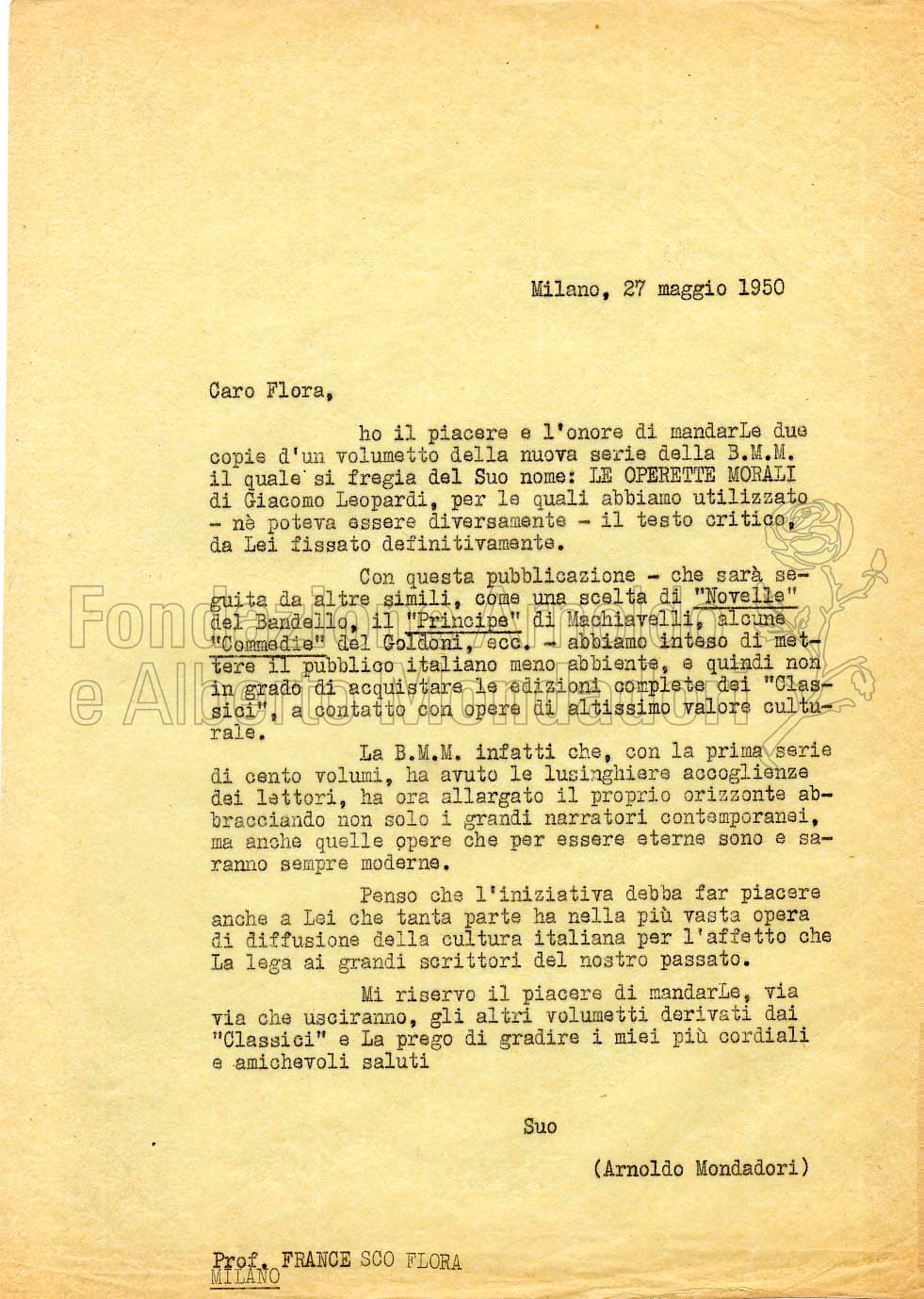 Arnoldo Mondadori omaggia Flora del volume di Leopardi della “Biblioteca Moderna Mondadori”, per il quale fu usato il testo curato dal critico e uscito in cinque volumi nei “Classici italiani”. Con la B.M.M., collana varata nel 1948, l’editore – come afferma in questa lettera – si proponeva di offrire anche a un pubblico meno abbiente opere di altissimo valore culturale. Milano 27 maggio 1950.