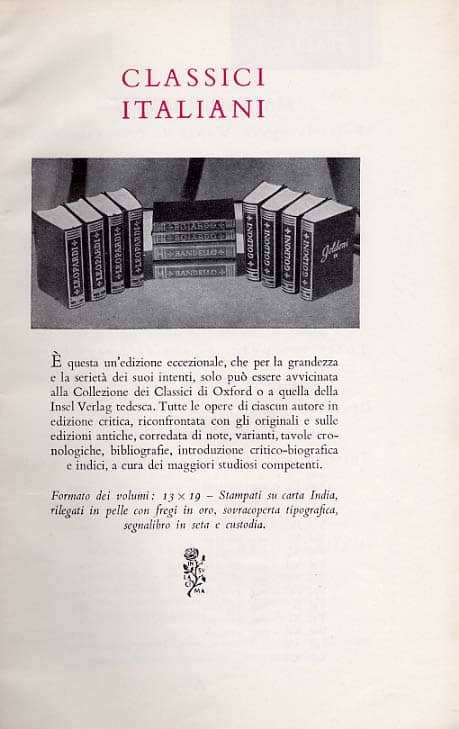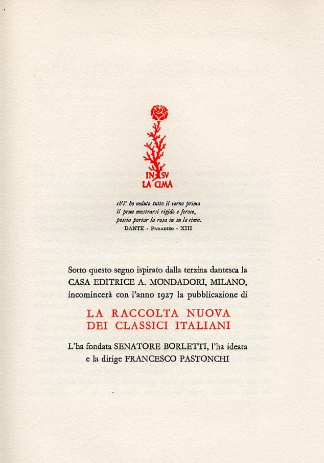 Nel frontespizio dei volumi dei “Classici italiani” si ritrova la rosa mondadoriana accompagnata dal motto dantesco “In su la cima”, simbolo ideato da Francesco Pastonchi. In controfrontespizio era riportata tutta la terzina (Paradiso XIII, 133-135) dalla quale il motto era tratto.