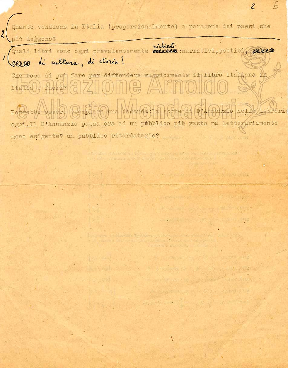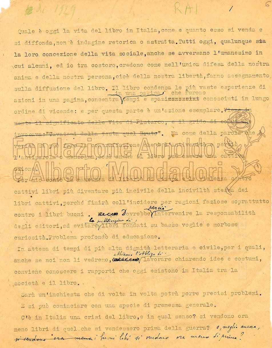 Interessante risulta il testo di questo intervento preparato da Flora per Rai Radio, in cui il letterato riflette sulla crisi della circolazione dei libri e sulla mancanza di libertà di stampa: «Per mio conto la mancanza di libertà di stampa e la violenza contro i cattivi libri più [sic] diventare più incivile della inciviltà stessa dei libri cattivi, perchè finirà con l’incidere per ragioni faziose soprattutto contro i libri buoni». Intervento per Rai Radio del 14 novembre 1949.