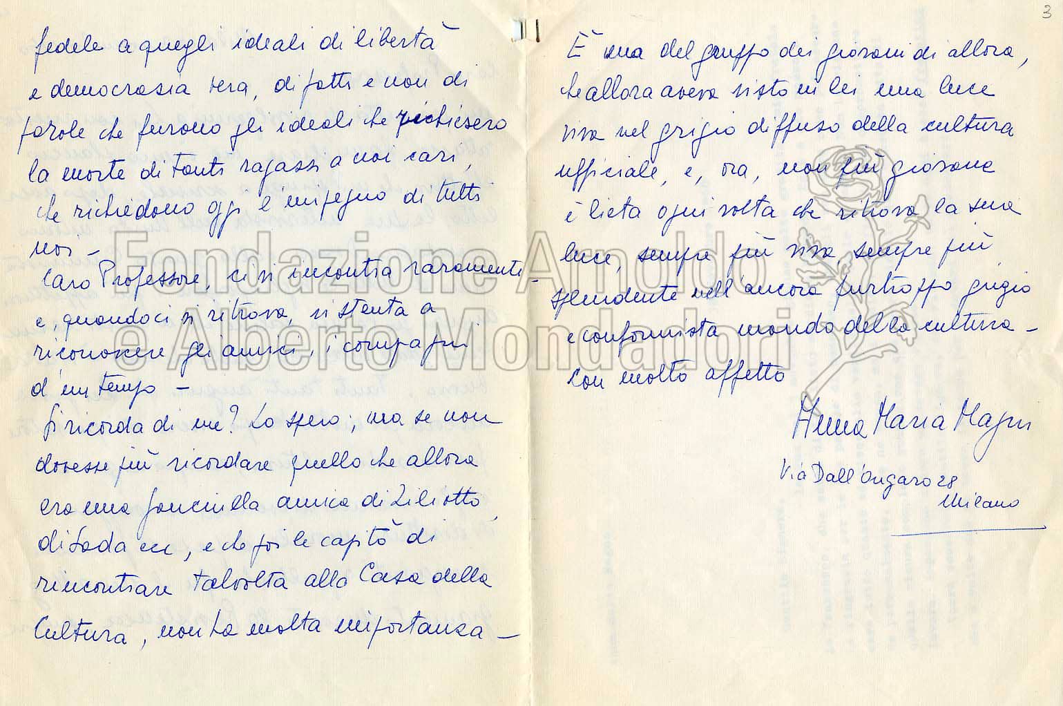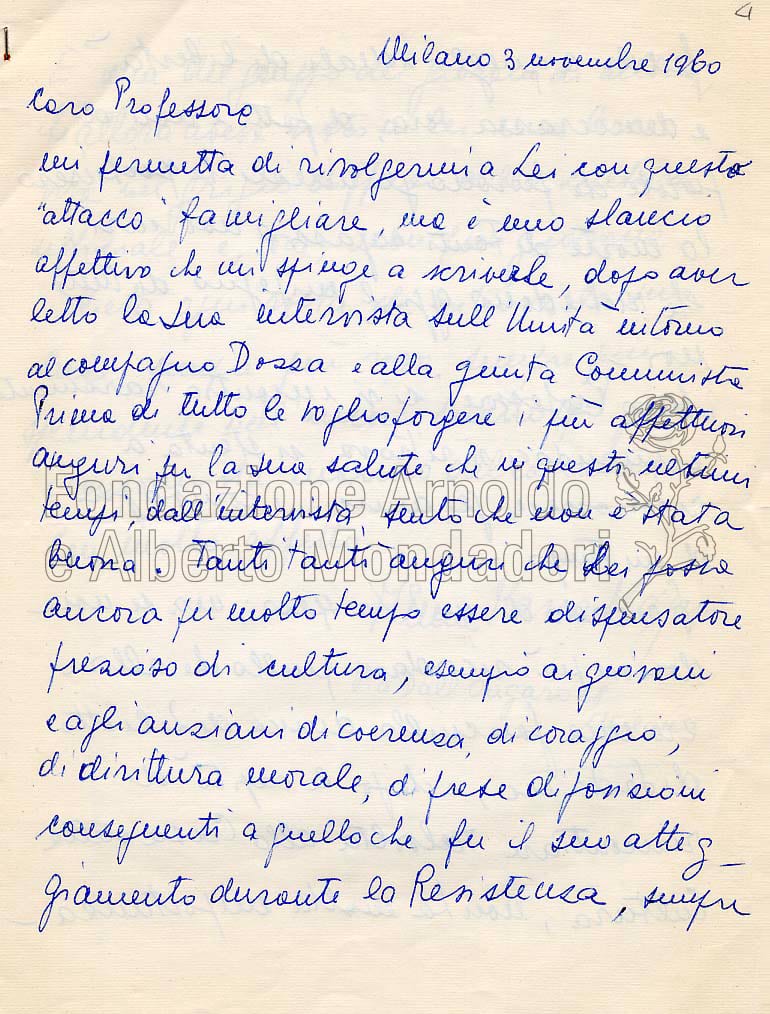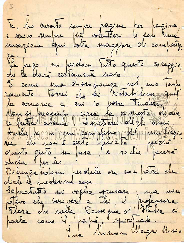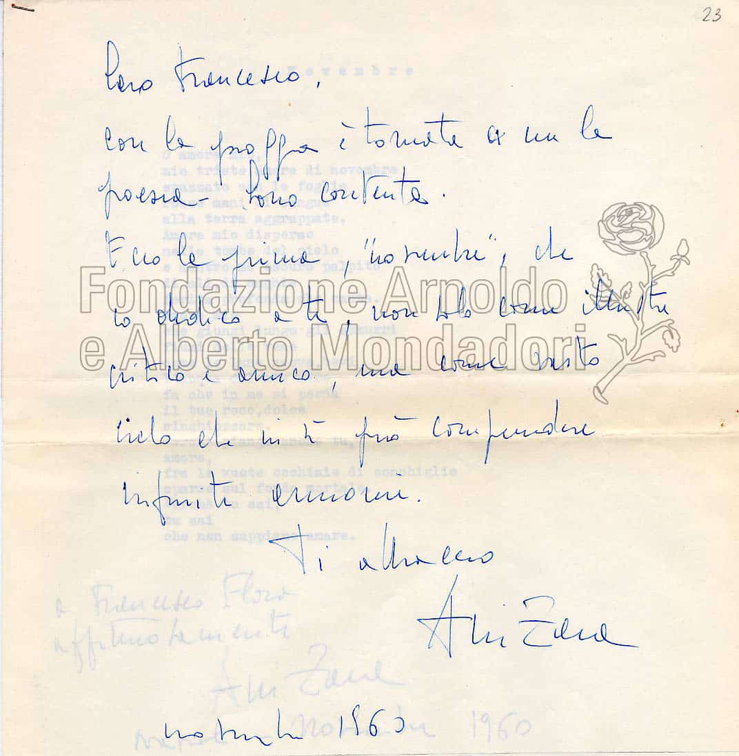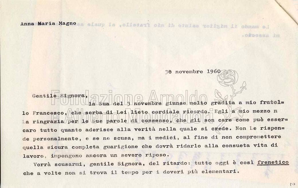 Punto di riferimento dei giovani e voce autorevole della cultura italiana, Flora riceveva moltissime lettere piene di espressioni di stima e ammirazione anche da chi non lo conosceva di persona e lo seguiva solo attraverso i suoi scritti e i suoi interventi sui giornali. Lettera di Anna Maria Magni del 3 novembre 1960.