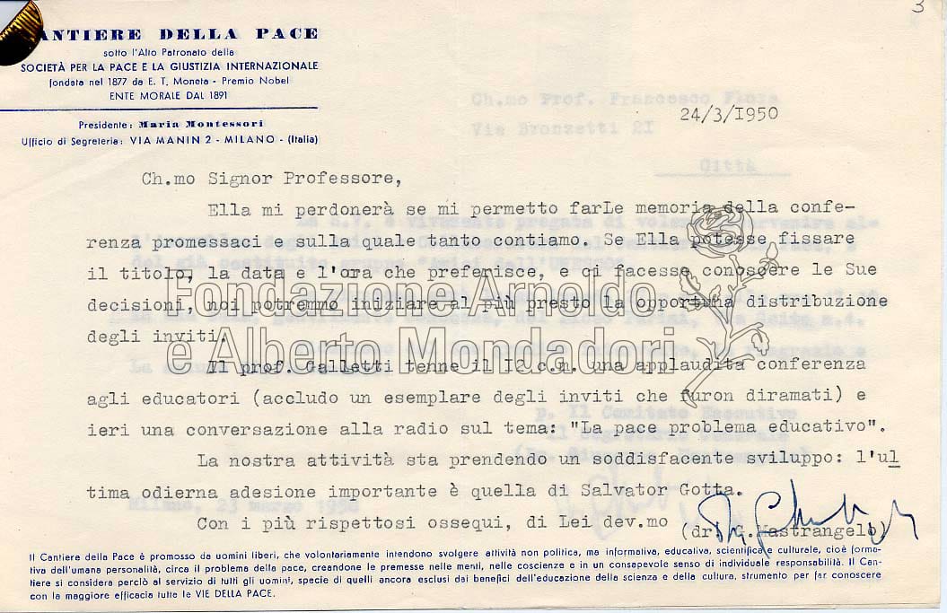 La fama e l’ammirazione di cui Flora godeva si leggono anche tra le righe del suo carteggio. Con questa lettera gli viene comunicato che è stato eletto, sotto la spinta di Arnoldo Mondadori, presidente del comitato costituito dal Centro del libro popolare e da alcuni editori. Roma 22 aprile 1950.