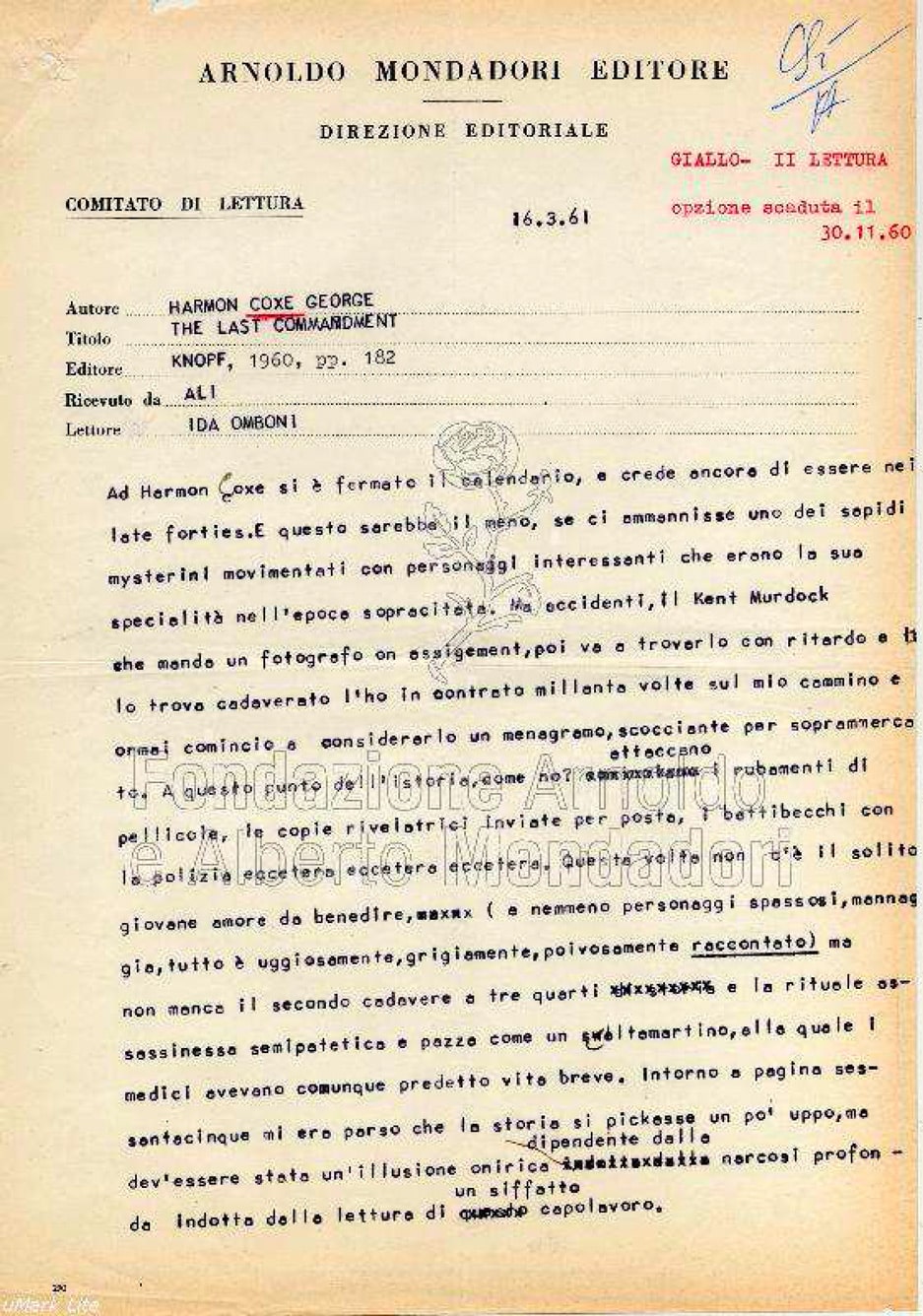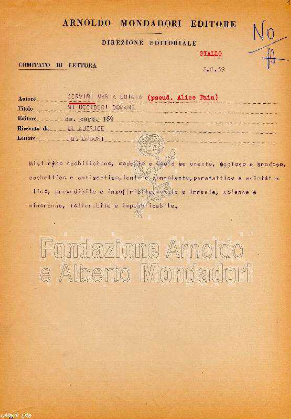 Così viene anche il dubbio che la Casa editrice abbia considerato la Omboni come un filtro severissimo in caso di autori esordienti di casa nostra che invadevano, con romanzi spesso tutt’altro che di valore, i tavoli dei funzionari. E proprio questi pareri, affilati come rasoi e spietati come bisturi, sono tra i più gustosi. Veri pezzi di bravura nel dire in poche parole tutto quello che (di negativo) c’è da sapere.