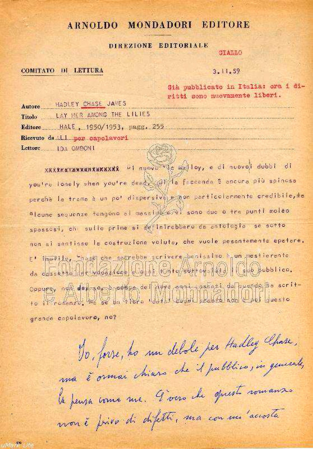 Già: il lavoro dietro le quinte. Nel QB9, dedicato proprio ad Alberto Tedeschi, sono state individuate le linee secondo le quali il direttore aveva gestito la principale di queste collezioni: quei “Gialli Mondadori” che ebbero tanto successo da determinare il nome stesso del genere, e da cui si sono poi diramate (per filiazione o per gemmazione) altre collane, mondadoriane e no. Il lavoro di Tedeschi era fortemente supportato dai suoi collaboratori. In questa sezione si vuole mettere a fuoco proprio questo aspetto della professione di Ida Omboni, testimoniata da centinaia di pareri stilati con una penna sapida e affilata, in grado di delineare in pochi tratti pregi e difetti non solo della coerenza narrativa del romanzo, ma anche dello stile, del ritmo, dei dialoghi, dei personaggi.