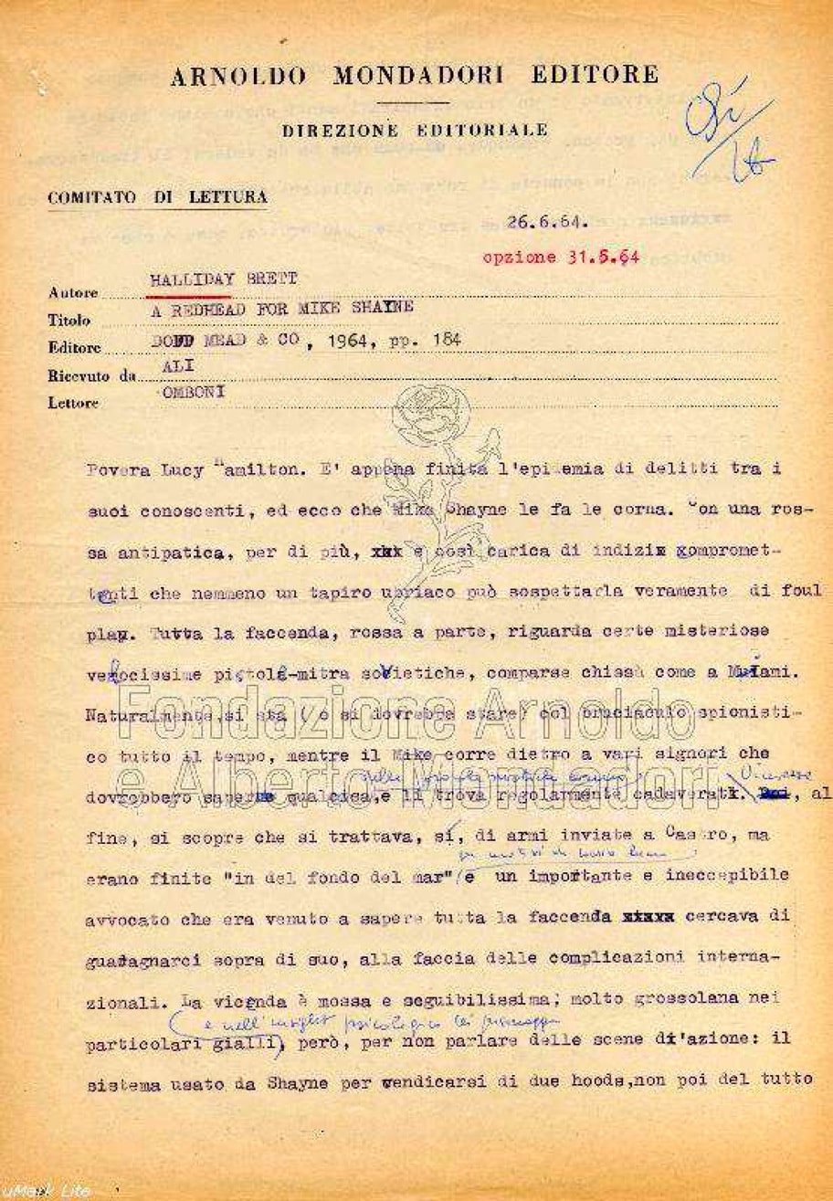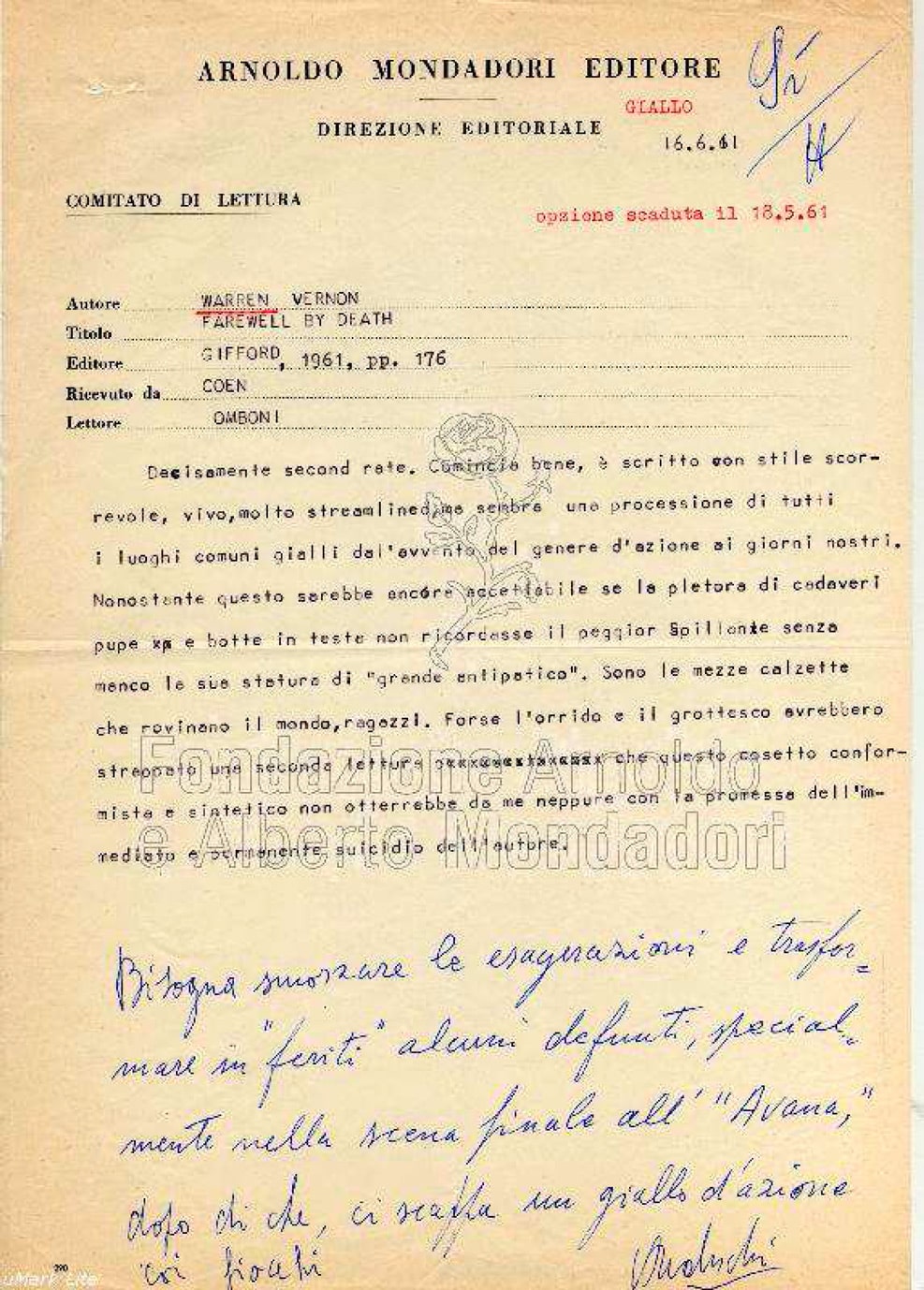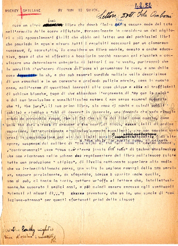 Non si può a questo punto rinunciare a un cenno al caso di Mickey Spillane, il creatore di Mike Hammer, e autore di gialli di grande valore narrativo, mai pubblicati dalla Mondadori per ragioni di autocensura. Negli anni cinquanta infatti in Italia non potevano circolare romanzi in cui si parlasse di droga, violenza, prostituzione, corruzione. Così Spillane venne messo al bando nonostante l’innegabile valore dei suoi romanzi. Ida Omboni, decisamente in anticipo sui tempi, aveva invece scritto una relazione non solo totalmente positiva su My gun is quick (1 febbraio 1954), ma aveva contestualmente affrontato anche il problema – attualissimo ai nostri giorni – di cosa si intenda per «moralità» di un romanzo e, più in generale, di un’opera d’arte («la moralità d’un’opera dipende dal come si presentano le cose, e non dalle cose in sé»). E quindi della necessità di trovare una collocazione editoriale in grado di rendere giustizia a «questi sfortunati primi della classe», penalizzati solo per saper scrivere in modo migliore di altri («Che si fa di libri come questo? […] gialli di ordine superiore, letterariamente e psicologicamente eccellenti, che non possono venire presi in considerazione per via dei limiti morali?»). Il parere è visionabile integralmente nel QB9.