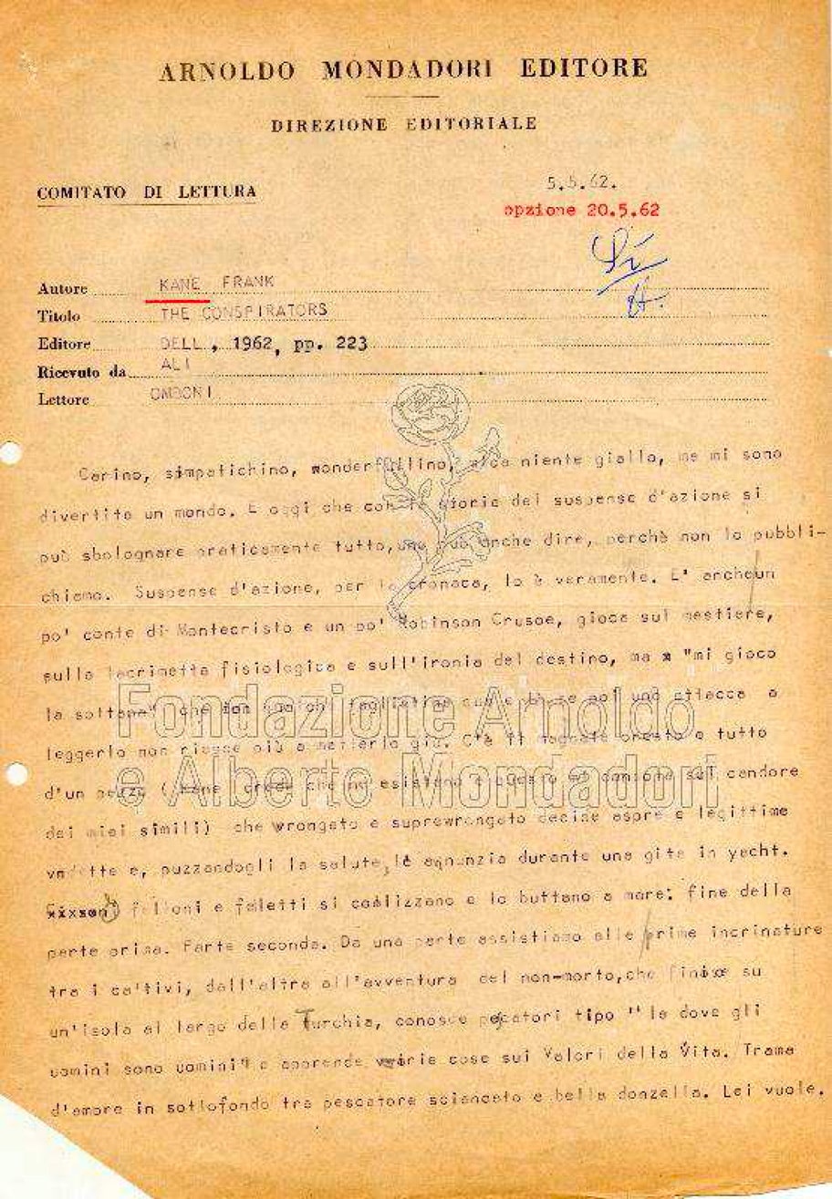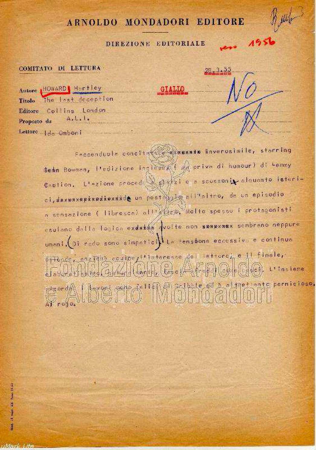 Ida Omboni aveva acquisito una fama di «cattiva» presso la casa editrice: quindi era fuori discussione l’ottima qualità di un libro quando sapeva suscitare il suo sincero interesse, ma in caso di parere negativo si riteneva spesso opportuno far passare il volume a una seconda lettura. In questo caso tra le carte relative al romanzo è conservato un parere decisamente positivo di Vittoria Comucci, che ne ha favorito l’accoglimento.