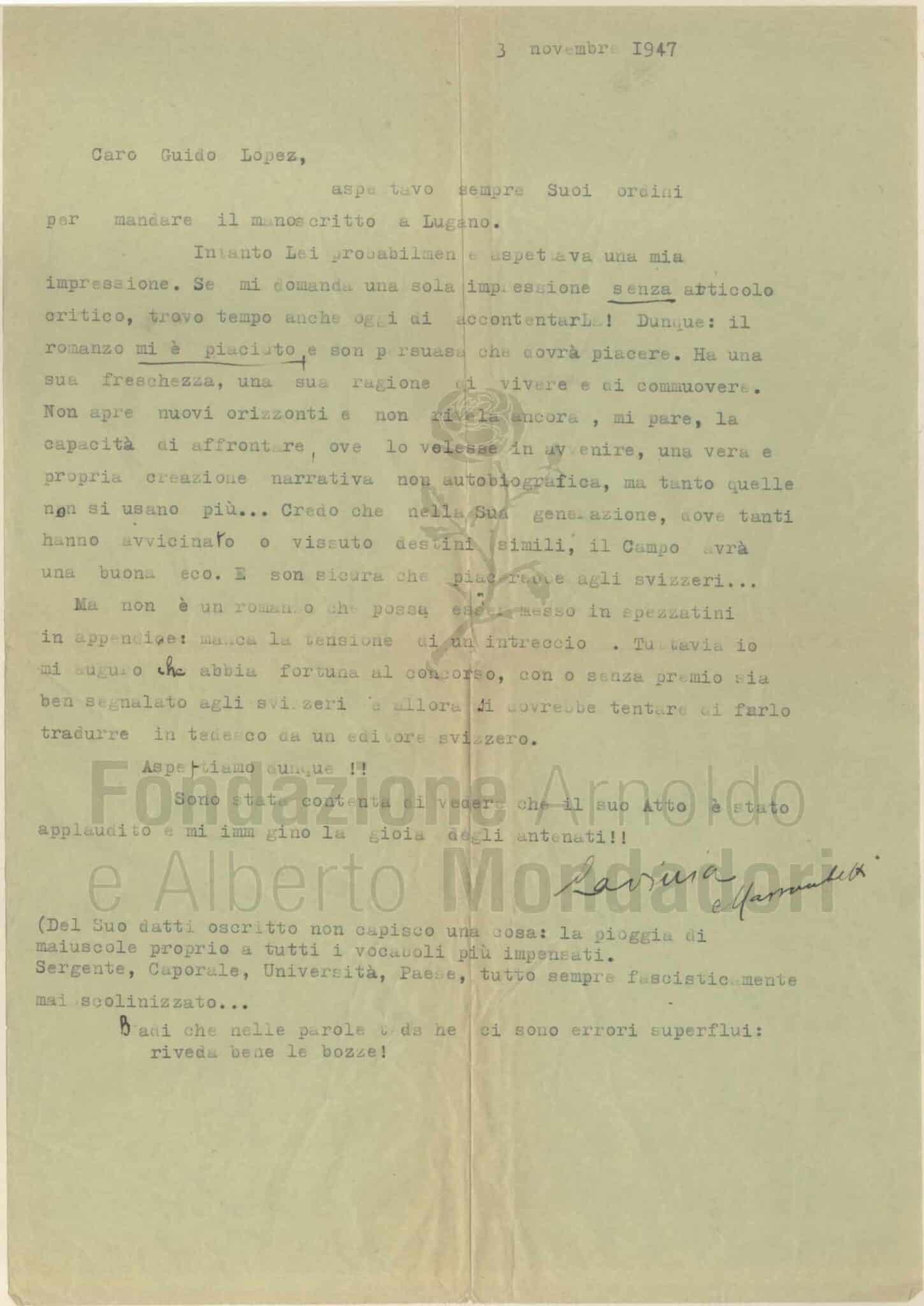 Se la gran parte delle unità archivistiche, all’interno delle sottoserie cronologiche, è intestata al mittente/destinatario, in alcuni segnalati casi, sono stati rinvenuti fascicoli originari dove Lopez aveva raccolto tutta la corrispondenza relativa a un evento o a una pratica specifica. Questo è quanto è avvenuto, ad esempio, in occasione della rappresentazione della sua prima opera teatrale, Fiducia, nel 1947, interpretata dalla Compagnia di Ruggiero Ruggieri. L’unità raccoglie infatti una trentina di lettere, telegrammi e biglietti di congratulazioni di colleghi e amici: tra questi Lucio Ridenti, il fondatore di “Il Dramma”, che proprio a partire da questa occasione di collaborazione (la commedia sarà pubblicata sulla rivista teatrale) stabilirà con Guido un rapporto di amicizia e stima reciproca che continuerà nel tempo (nell’archivio sono presenti 16 fascicoli intestati a Ridenti per un arco cronologico che va dal 1947 al 1966). Più copioso è il carteggio raccolto nel fascicolo “Posta per il Campo”, dove si trovano 52 documenti riguardanti l’uscita per Mondadori, nella collana “La medusa degli italiani”, del suo primo romanzo, l’autobiografico Il Campo, ispirato alle vicende vissute durante la Seconda guerra mondiale nei campi profughi in Svizzera. Tra questi, le lettere inviate dai colleghi, giornalisti/intellettuali, che si occupavano di recensire il volume – Antonio Baldini, Aldo Capasso, Lorenzo Gigli, Carlo Linati; scrivevano a Guido anche, tra gli altri, Giorgio Monicelli, Alba de Céspedes e Lavinia Mazzucchetti.