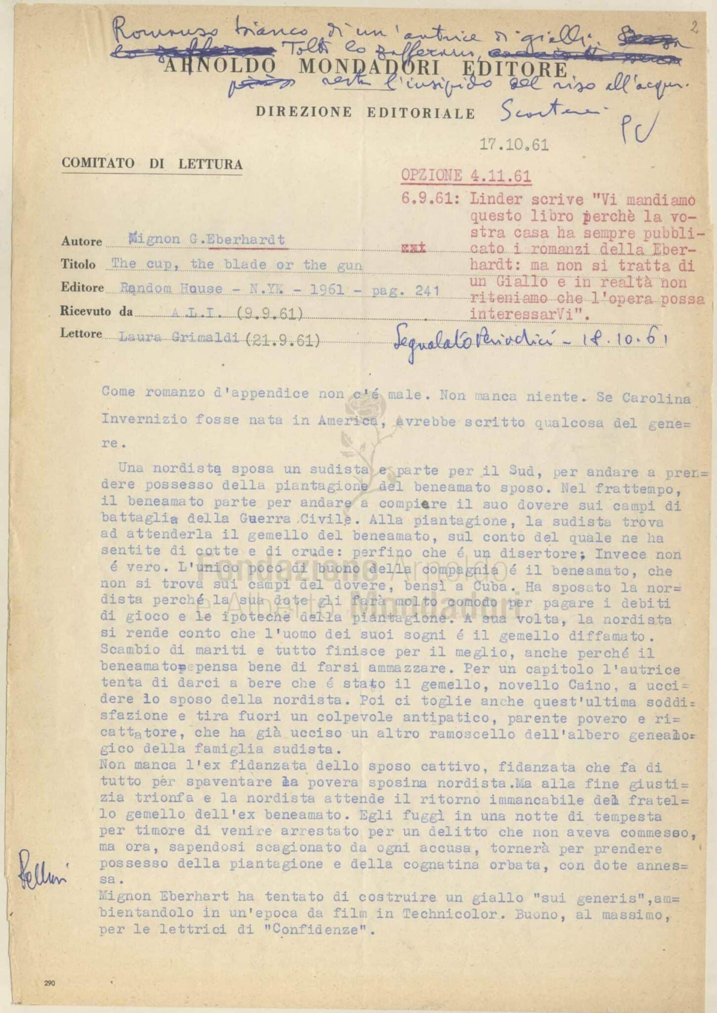 Mignon G. Eberhart ha tentato di costruire un giallo “sui generis”, ambientandolo in un’epoca di film in Technicolor…Buono al massimo per le lettrici di “Confidenze”».