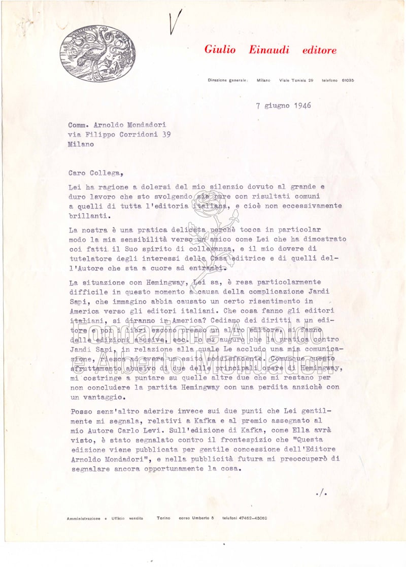 Da abile diplomatico quale è, Giulio Einaudi, dopo aver rifiutato di concedere a Mondadori i diritti per la pubblicazione di Avere e non avere di Hemingway, porta all’attenzione dell’editore milanese la pubblicità dedicata sul primo numero di “Politecnico” mensile alla sua casa editrice: sul numero 29 della rivista – che inaugura appunto la serie mensile – si trovano infatti due pubblicità a libri Mondadori; si annuncia, con un’ampia anteprima, il romanzo di R. Hillary L’ultimo avversario, in uscita nella collana “Arianna” e viene dedicato notevole spazio alle illustrazioni di Guttuso per Addio alle Armi di Hemingway, che verrà pubblicato da Mondadori nella collana “Il ponte” nella traduzione di Fernanda Pivano.