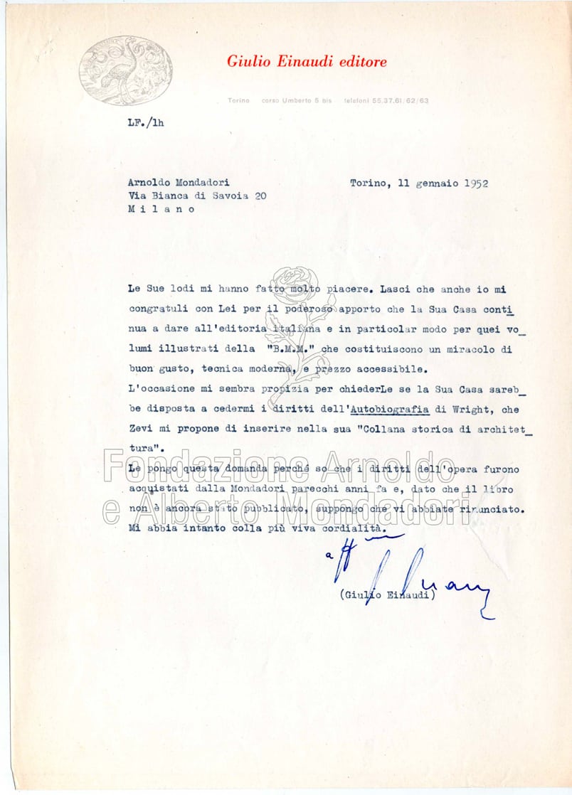 Anche Giulio Einaudi ha modo di esprimere, in modo sempre misurato ma non privo di sincera partecipazione, la sua ammirazione per l’attività della Casa milanese. In particolar modo mostra di apprezzare le iniziative delle collane economiche, tra le quali la “Biblioteca Moderna Mondadori”, che definisce «un miracolo di buon gusto, tecnica moderna e prezzo accessibile».