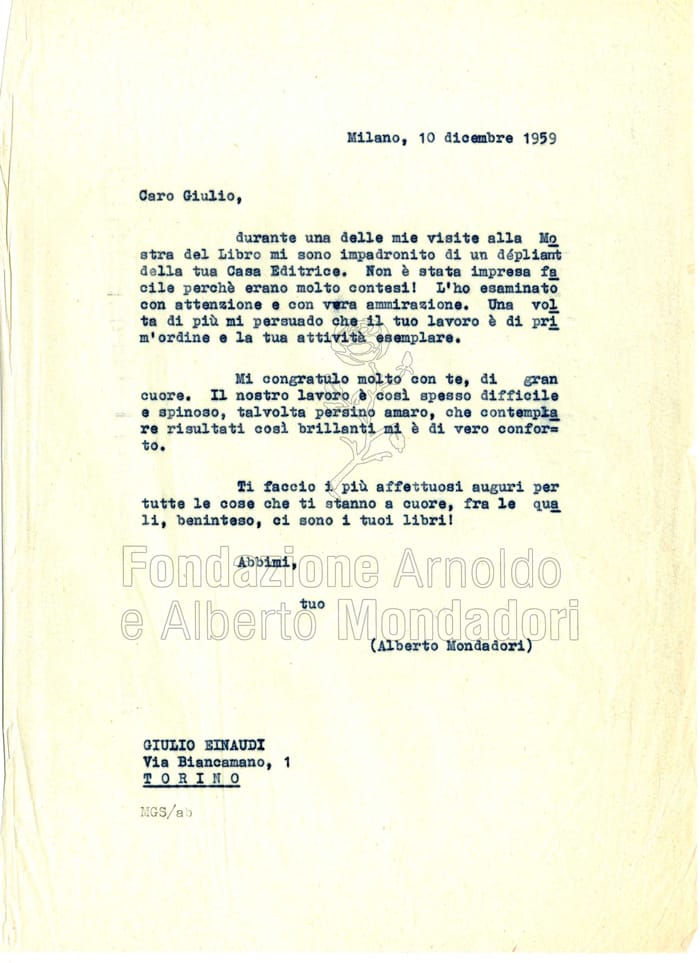 Una delle tante dimostrazioni di ammirazione da parte di Alberto Mondadori per l’attività di Giulio Einaudi. Alberto, che ha da poco intrapreso l’avventura del Saggiatore, si rivolge a Giulio da pari a pari: «il nostro lavoro è così spesso difficile e spinoso, talvolta persino amaro, che contemplare risultati così brillanti mi è davvero di conforto».