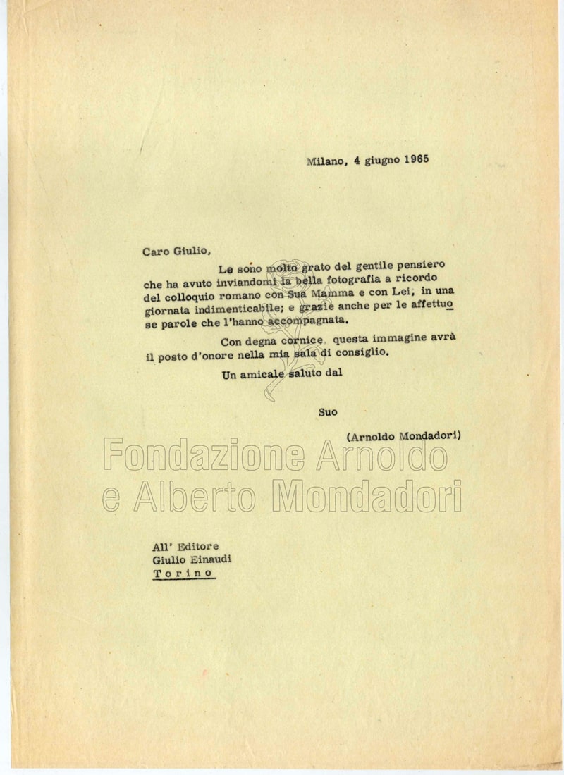 Nelle lettere di Arnoldo talvolta la formalità lascia spazio a momenti di schietta condivisione di pensieri. Con questa lettera Arnoldo Mondadori ringrazia Giulio Einaudi per avergli spedito la foto ricordo di un incontro a Roma cui era presente anche la madre dell’editore torinese.