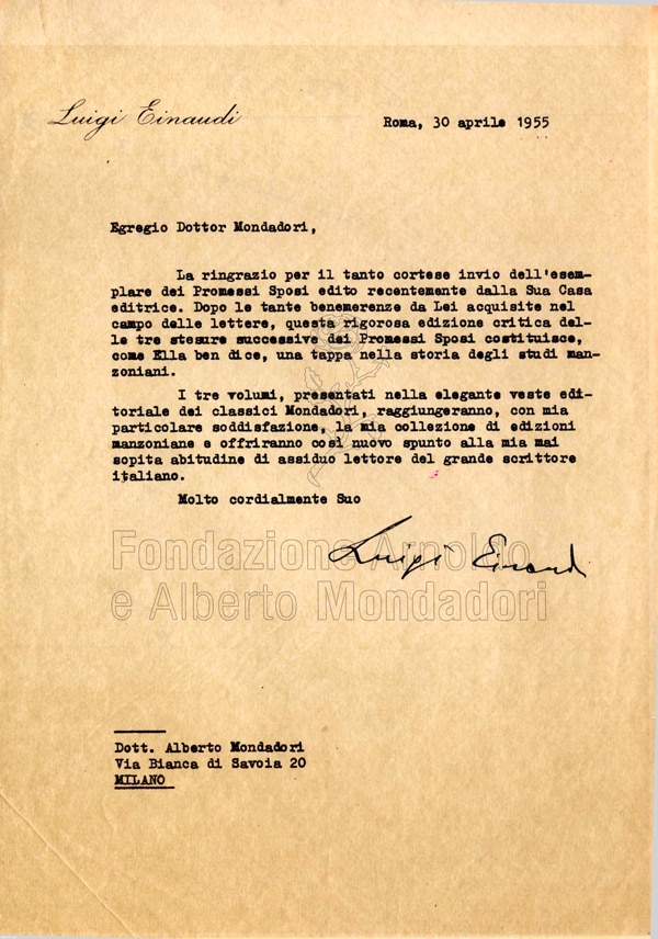 Luigi Einaudi ringrazia Alberto Mondadori per i libri ricevuti in dono: sono i tomi contenenti le tre redazioni dei Promessi Sposi pubblicati nei “Classici italiani” – collana diretta da Francesco Flora – a cura di Alberto Chiari e Fausto Ghisalberti nel 1955.
