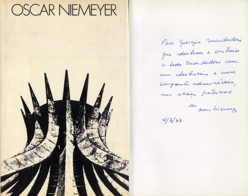 Nel marzo 1977 Niemeyer dedica una copia di Oscar Niemeyer a Giorgio Mondadori. Così il testo portoghese: