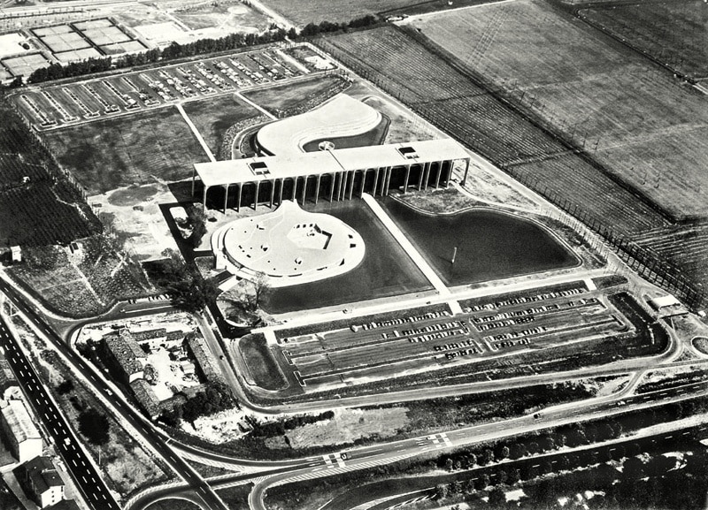 6° Gli accessi (dis. 84) potranno essere ulteriormente studiati sia dal viale della circonvallazione (a), soluzione che ci sembra decisamente la migliore, sia dalla strada provinciale (b). Le due soluzioni mantengono la facciata principale dalla parte della circonvallazione, come è meglio. Il parcheggio è previsto per 1.000 veicoli. La varietà degli archi, le superfici vetrate delle facciate, le forme quasi astratte dei servizi generali e lo specchio d’acqua che arricchisce il tutto sono i complementi plastici dell’insieme che garantiranno, speriamo, all’AME l’importanza desiderata, e ai suoi visitatori l’effetto che solo la sorpresa . e la bellezza possono provocare”.