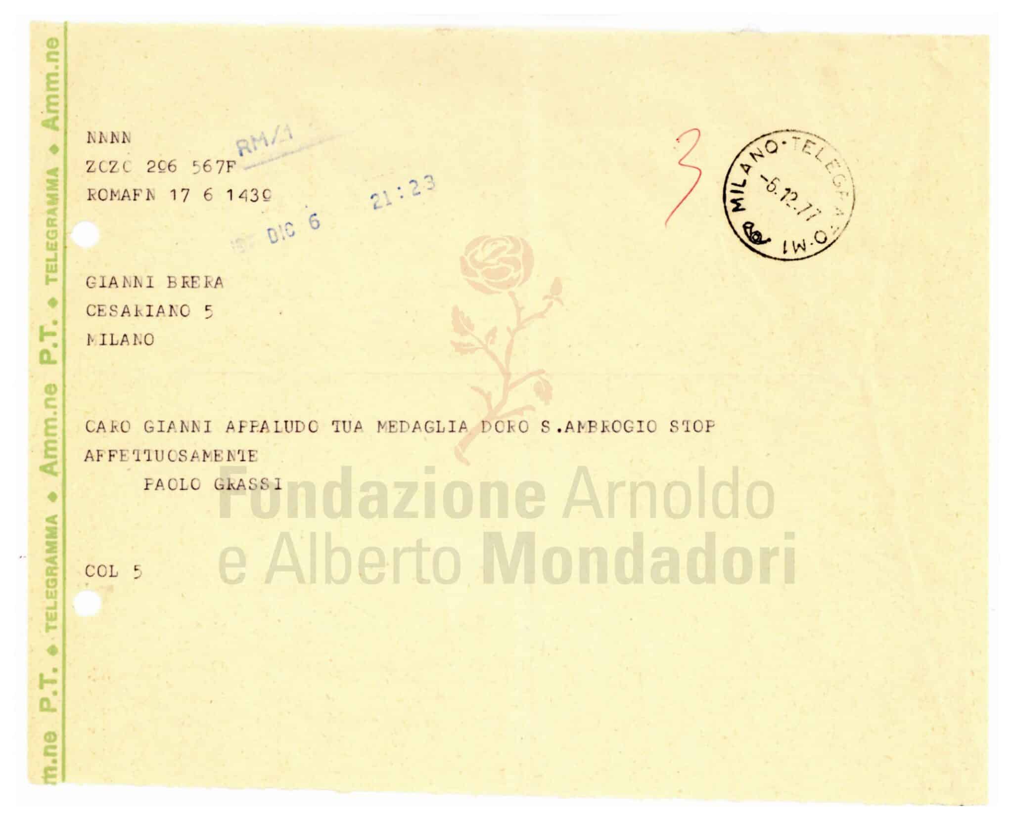 • Nell’Archivio di Gianni Brera è conservato un fascicolo Paolo Grassi, contenente un telegramma del 5 dicembre 1977 (b. 13, fasc. 243)