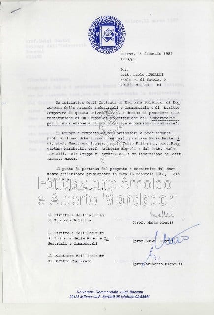Tra il 1989 e il 1997 ha inoltre diretto il Laboratorio per la Comunicazione Economica Finanziaria dell’Università Luigi Bocconi (Lacef): sono la corrispondenza, le relazioni, gli appunti e i materiali a stampa raccolti nel suo archivio a restituircene le fasi più significative.
