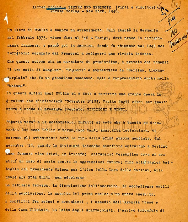 Di Alfred Doblin la Mondadori ha pubblicato Giganti, “Medusa”, n.29, 1934; Senza quartiere, “Medusa”, n.78, 1937; Confucio, “Biblioteca moderna Mondadori”, n.94, 1949.