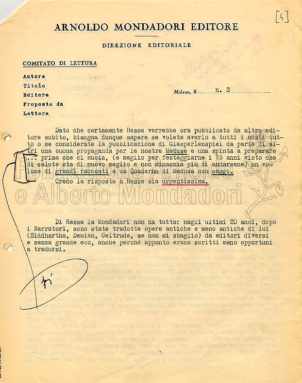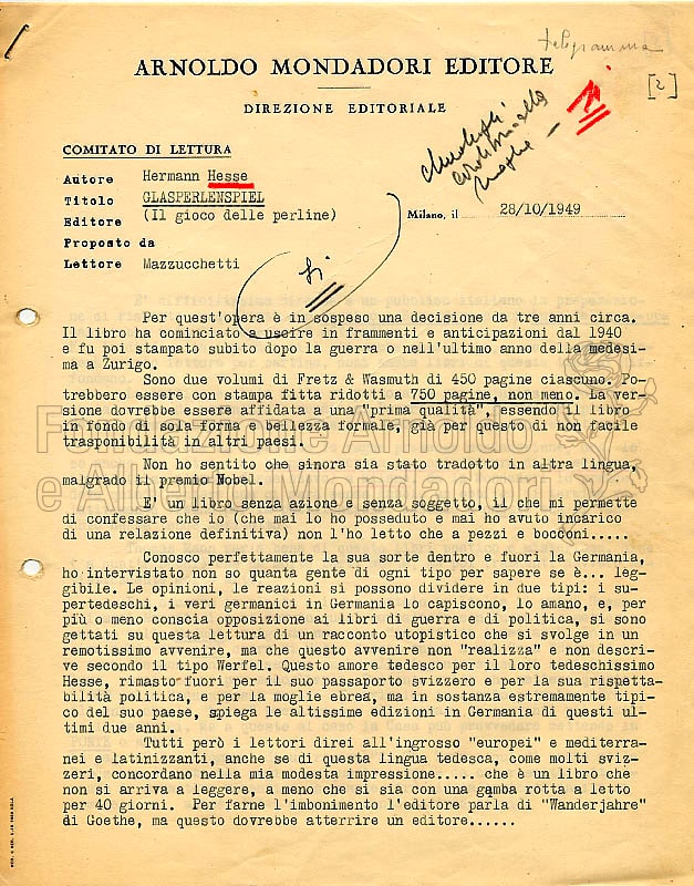 Uno dei più difficili romanzi di Herman Hesse, come pure sottolinea Lavinia Mazzucchetti, destinato però a diventare un grosso successo, forse anche al di là di quanto pensasse la prima lettrice italiana. Il volume è uscito in “Il ponte” nel 1956 per la traduzione di Ervino Pocar (come si può notare dalle date, la traduzione ha necessitato più di cinque anni di lavoro) e ha poi avuto una lunga serie di riedizioni in varie collane mondadoriane (“I classici contemporanei stranieri”, 1966; “Biblioteca Mondadori”, 1876; “Biblioteca”, n.12, 1978; “I meridiani”, 1978)