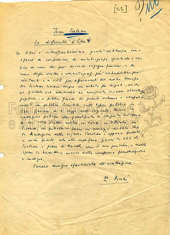 Il libro è interessantissimo, perché costituisce una specie di confessione, di autobiografia spirituale e critica di uno dei più discussi ingegni francesi, e di uno degli scrittori e commediografi più contraddittori, più irritanti e a volte più affascinanti del nostro tempo. Ma Cocteau rimane sempre un artista per iniziati, anche se qualche sua commedia ha conseguito successi abbastanza popolari: il pubblico quindi di questo volume è necessariamente un pubblico limitato, quel tipico pubblico che i libri francesi se li legge nell’originale. Ancora la traduzione potrebbe esser giustificata se compiuta ad opera di un vero scrittore nostro, un Cecchi, un Vittorini, un Piovene, che potrebbero farne un esercizio di stile. Ma la traduzione della signora Paroldo è appena fedele e anche fedele solo alla superficie, giacché lo stile di Cocteau è pieno di tranelli, come il suo pensiero, e molto spesso la traduttrice manca della necessaria penetrazione e malizia.