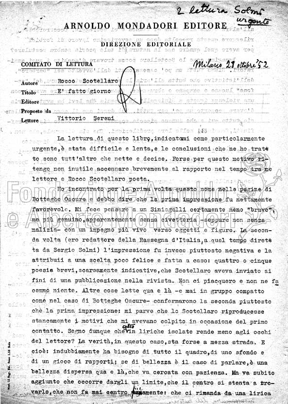 Sereni, prima di diventare direttore letterario della Mondadori, aveva a lungo collaborato con la Casa Editrice come consulente esterno e come lettore. Nel testo qui riprodotto esprime il suo parere sull’opera del giovane poeta lucano diventato celebre solo dopo la sua morte prematura. Questa prima raccolta fu infatti pubblicata sullo “Specchio” nel 1954 (con prefazione di Carlo Levi), l’anno successivo la sua scomparsa. Il libro vinse il Premio Viareggio. Seguì, sempre nello “Specchio”, Margherite e rosolacci (1941-1953), pubblicato nel 1978. Di È fatto giorno è uscita anche un’edizione riveduta e integrata nel 1982, a cura di Franco Vitelli (in “Oscar”, n.1539).