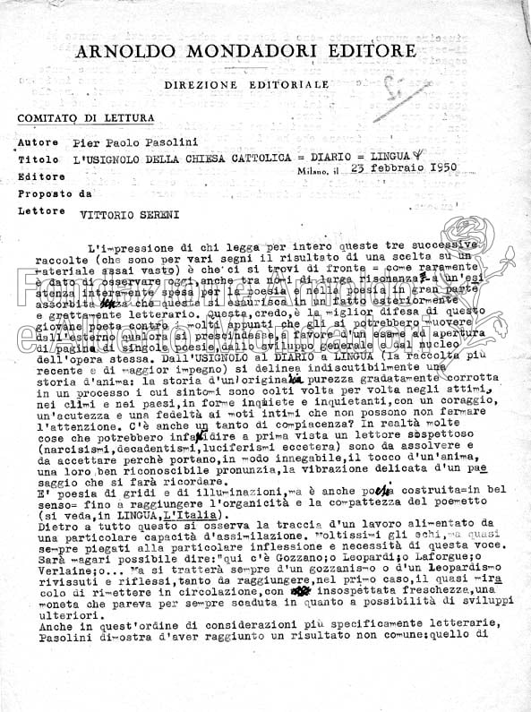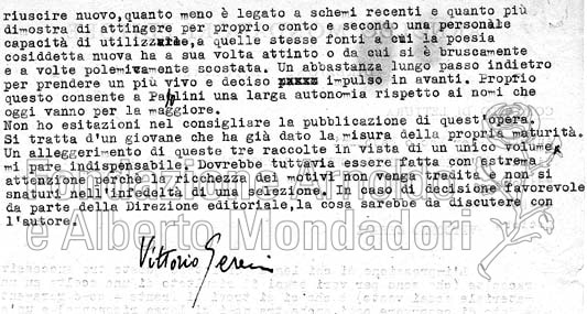 È uno dei primi pareri di lettura a firma di Vittorio Sereni conservati in archivio, di molto precedente alla sua attività di direttore letterario. Pasolini non fu mai pubblicato da Mondadori, ma il testo in esame uscì presso Longanesi, nel 1958.