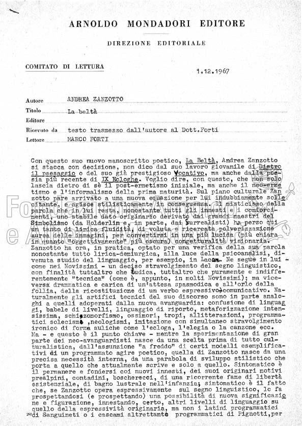 La più prestigiosa collezione di poesia della Mondadori è certamente “Lo specchio” che, nata nel 1940 come una raccolta opere poetiche, ma anche di testi in prosa (narrativa e saggistica), si è poi specializzata in poesia. Negli anni Cinquanta, per volontà di Alberto Mondadori (ideatore della collezione, isieme ad Arturo Tofanelli) con la collaborazione di Giuseppe Ravegnani, la collana si era aperta anche ad autori stranieri (la prima raccolta è stata Poesie di Emily Dickinson, nel 1956) e, per gli italiani, si era posta come una sorta di “trampolino di lancio” per giovani firme. Per espressa scelta di Arnoldo Mondadori, con la direzione di Marco Forti, la collana è diventata un punto d’arrivo per autori già affermati. Proprio di Forti sono molti giudizi editoriali relativi a testi di poesia, insieme a quelli di Vittorio Sereni (direttore letterario e lui stesso autore dello “Specchio”) e di Franco Fortini. Questi pareri sono tutti conservati nel Fondo Autori