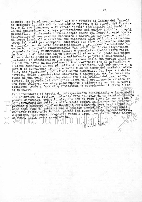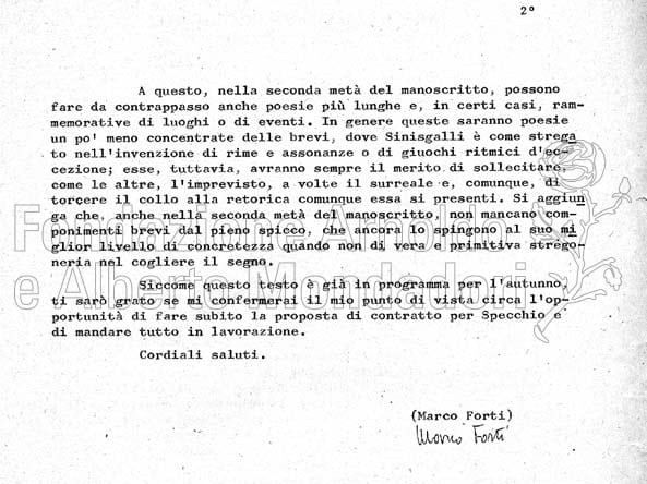 Il giudizio di Forti è compilato su un foglio di servizio intestato “Arnoldo Mondadori Editore” ed è formulato come lettera a Vittorio Sereni. Non è raro che i funzionari della Casa si scambiassero lettere in cui le osservazioni su un testo in esame prendevano le dimensioni di veri e propri pareri interni. Si noti l’appunto manoscritto in margine al testo, di mano di Sereni. La raccolta di Sinisgalli è stata pubblicata nello “Specchio” nel 1970.