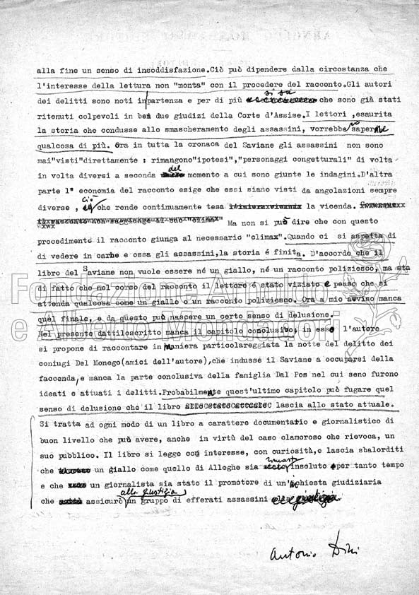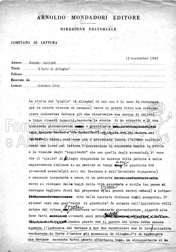 In questo libro, pubblicato in “Varia” nel 1964, Sergio Saviane ha ricostruito le vicende di misteriosi delitti avvenuti ad Alleghe, un paese sulle montagne della provincia di Belluno. Le oscure vicende di una serie di morti collegate tra loro avevano offerto a Saviane l’opportunità di un’indagine in piena regola, che aveva anche risvegliato l’attenzione delle stesse autorità giudiziarie. In seguito alla pubblicazione di questo libro, infatti, furono riaperte le indagini sulla vicenda. In generale, la cronaca negli anni Sessanta affascinava il pubblico più che un giallo di invenzione, quindi vari volumi ispirati a eventi di cronaca furono pubblicati con successo dalla Mondadori. I fatti di Alleghe sono stati recentemente ricostruiti da Carlo Lucarelli in una puntata della trasmissione Blu notte (RaiTre).