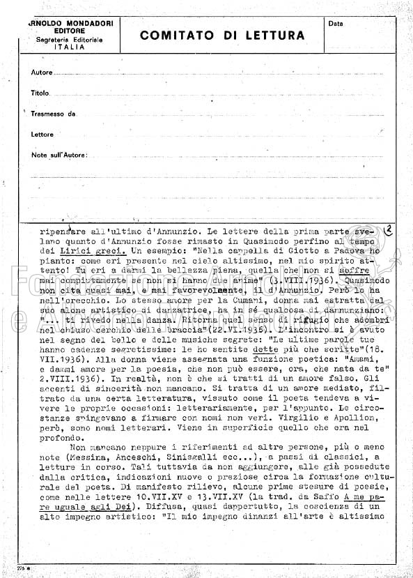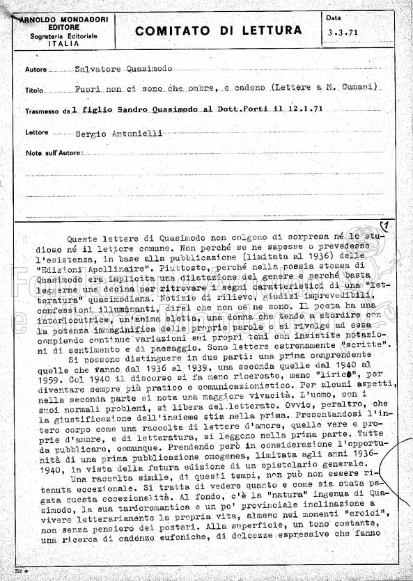 Un differente genere letterario per uno dei maggiori poeti del Novecento italiano, che, come suggerisce il lettore, attraverso la presenza di “una interlocutrice, un’anima eletta” amplifica spunti già presenti nelle sue liriche. Sergio Antonielli fu tra i lettori esterni più assidui nel ventennio 1950-’70 e a lui si devono molti dei pareri conservati nel Fondo Autori.