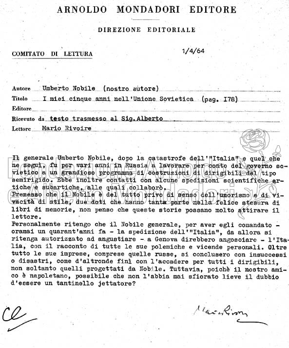Di Umberto Nobile la Mondadori aveva pubblicato, in diverse collane, numerosi volumi di memorie relativi alle sue straordinarie imprese. Da L'”Italia” al Polo Nord, in “Viaggi e grandi imprese”, 1930, a Posso dire la verità (Storia inedita della spedizione polare dell'”Italia”, “Le scie” 1945; da Gli italiani al Polo Nord, “Arcobaleno”, n.24, 1959, a La tenda rossa, ancora “Le scie”, 1969, e altri ancora. Un ulteriore libro sarebbe stato davvero ridondante, anche secondo l’opinione del lettore, e infatti il volume non fu pubblicato.