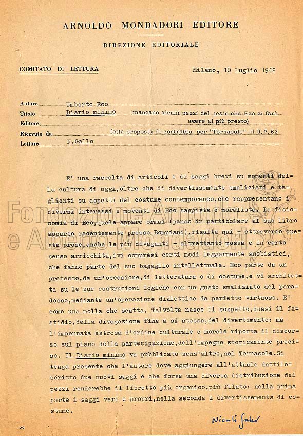 Ancora lontani gli anni dei grandi romanzi, Eco stava consolidando allora la sua fama come semiologo, come esperto di comunicazione di massa, come studioso della cultura di consumo. E’ questo il libro che lo ha reso noto al pubblico. Un pubblico ancora elitario, ma molto interessato agli sviluppi del giovane studioso italiano. Il testo è stato pubblicato in “Il tornasole”, 1963. Si noti la firma del giudizio, di Niccolò Gallo: direttore delle collane di narrativa italiana (“La medusa degli italiani” e “Narratori italiani”) e ideatore di “Il tornasole”