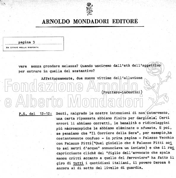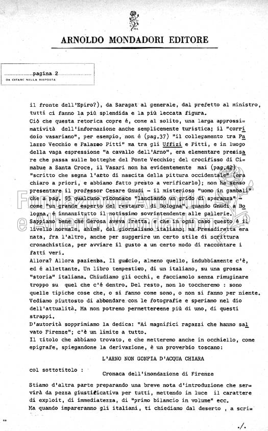 La ricostruzione proposta da Gerosa della piena dell’Arno che devastò Firenze il 4 novembre 1966, fu pubblicata in tempi record, in modo da arrivare sul mercato prima di eventuali altri volumi sullo stesso argomento. Dal parere di lettura si evince che il volume inizialmente avrebbe dovuto uscire nella collana “Presadiretta” (1966-’74) che ospitava testi di storia contemporanea e di attualità. Il volume entrò invece nella collana “Varia ”, 1967.