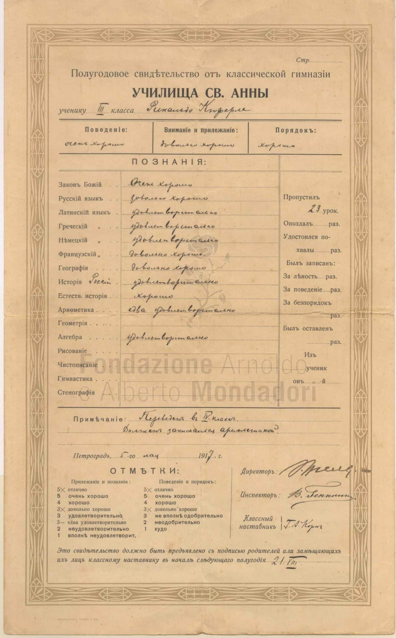 Pagella del ginnasio Sant’Anna, 5 maggio 1917
