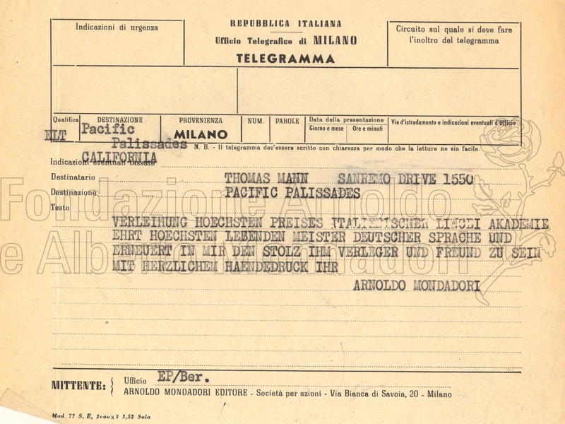 Telegramma di Arnoldo Mondadori a Thomas Mann, 1952