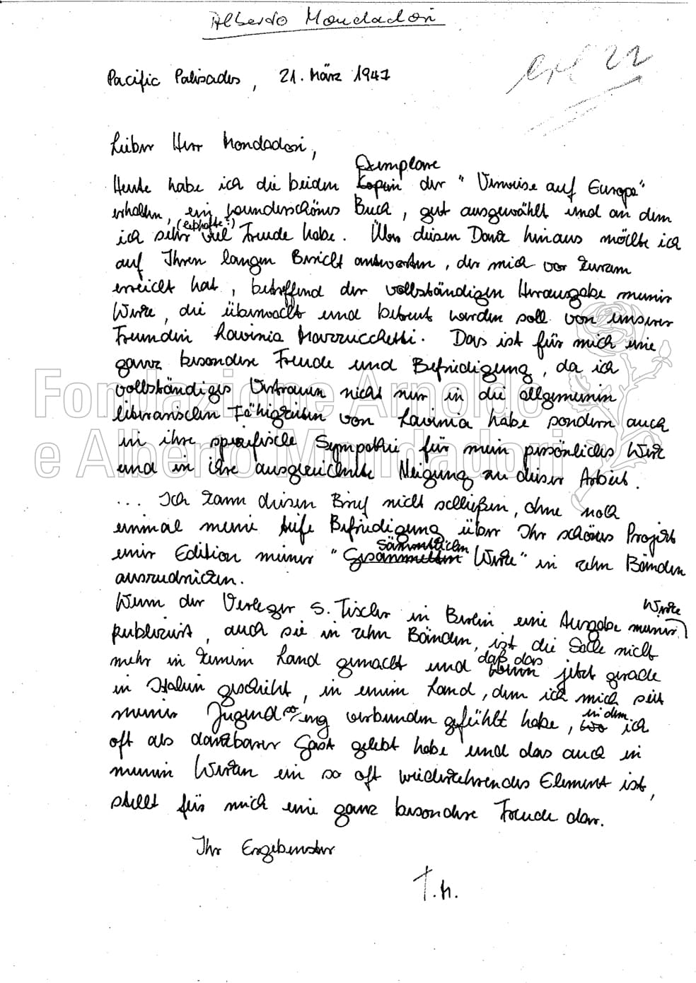 Lettera di Thomas Mann ad Alberto Mondadori, 21 marzo 1947