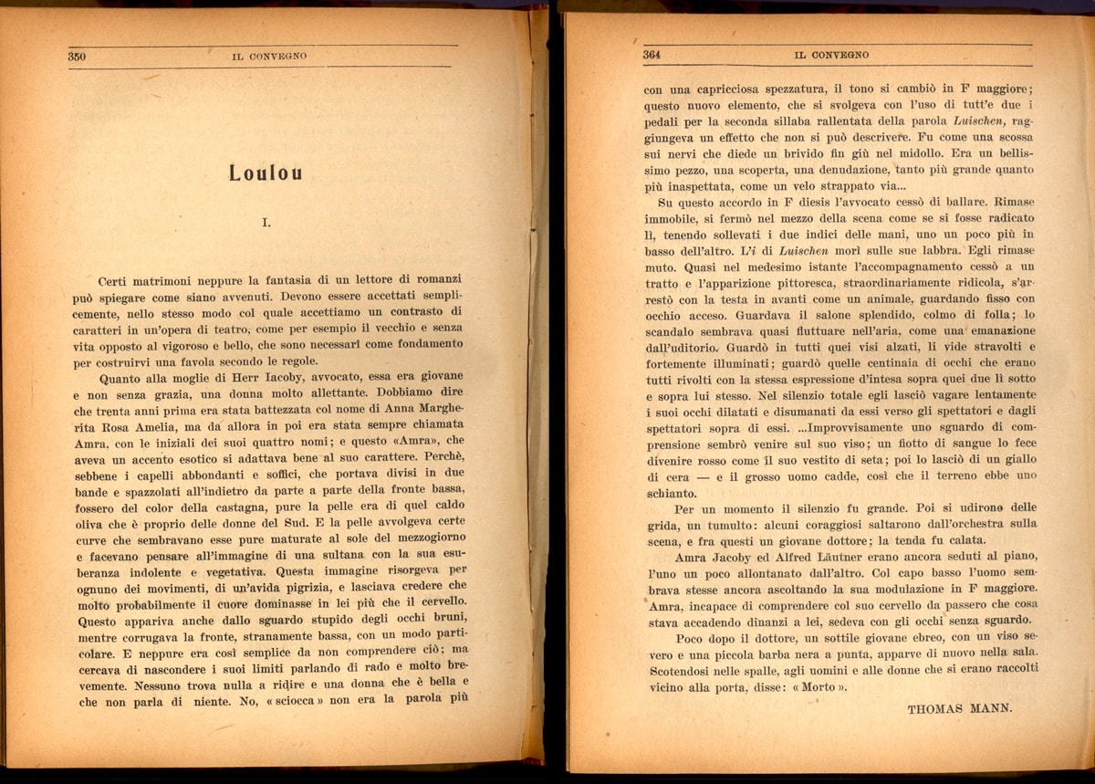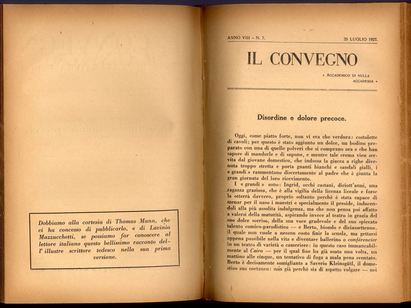 Lavinia Mazzucchetti ha divulgato l’opera di Thomas Mann in Italia anche creando validi contatti tra lo scrittore e le riviste letterarie più prestigiose dell’epoca. Tra queste annoveriamo «Il Convegno» di Enzo Ferrieri. Sulla rivista è stata pubblicata, nel 1921, la traduzione del racconto Luischen con il titolo Loulou, ispirato alla versione francese e modificato nelle edizioni librarie successive con il titolo Luisella. Sono seguiti, nel 1927, Disordine e dolore precoce tradotto dalla Mazzucchetti e, nel 1929, la pubblicazione di alcuni passi de La montagna incantata. In una lettera a Enzo Ferrieri, Thomas Mann esprime la sua soddisfazione per l’attenzione dedicata alla sua opera.