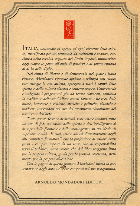 Riproduciamo alcune delle prove di stampa delle pagine, uscite nell’autunno del 1945 sul Giornale della libreria. La pagina introduttiva fu parzialmente modificata rispetto a quella che possiamo visionare. Delle ventitre pagine originali, dieci riguardavano collezioni già esistenti o le nuove collezioni di orientamento saggistico e documentario, tredici erano dedicate a libri ed autori singoli. Ne abbiamo scelte alcune tra le più significative.