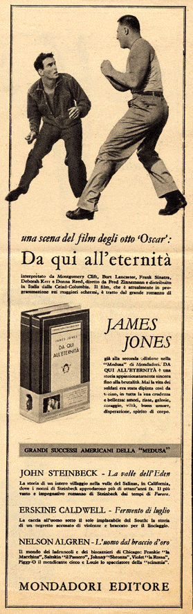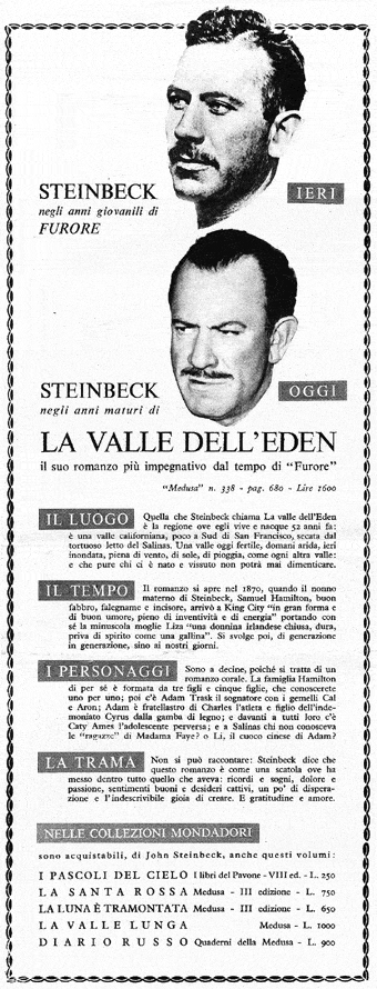 Abbiamo scelto un ritaglio di una copertina e di una pagina della rivista “Epoca” del 1954. Entrambi sono dedicati, in un momento di grande attenzione per il mondo d’oltreoceano, ad autori americani e ai loro libri di successo apparsi nelle collane Mondadori
