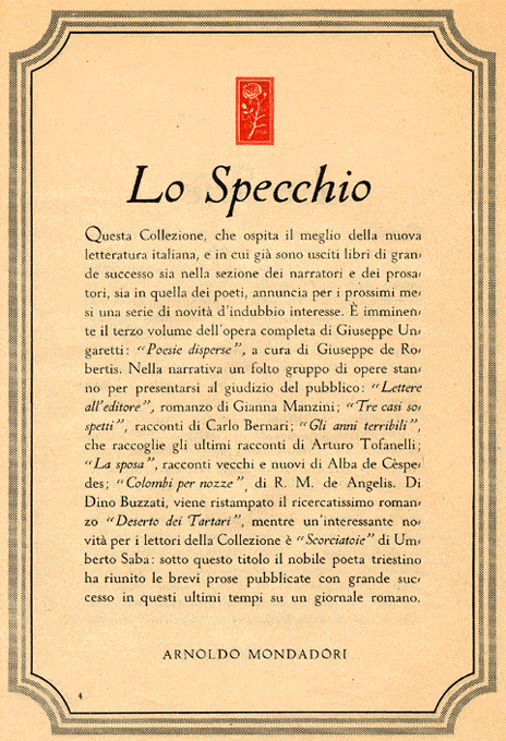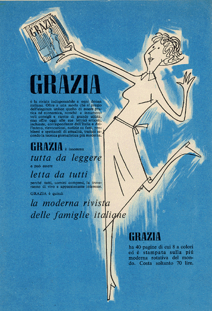 Non è stato possibile datare con precisione e stabilire a quale periodico appartenessero le pagine che qui abbiamo selezionato. Tutte e tre si rivolgono al grande pubblico. La prima pubblicizza Ambra, un dramma passionale, a fosche tinte, uscito nella collana Omnibus. La seconda presenta “Grazia” “la rivista indispensabile a ogni donna italiana”; la terza invita a donare ai propri bambini “tanti bei libri Mondadori” sotto la forma di una letterina di Natale