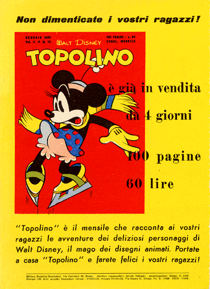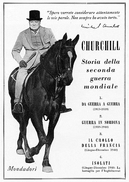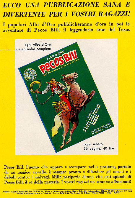 Le pubblicità apparse sulle copertine dei “Gialli” sono le più numerose. Si collocano nell’arco cronologico 1949-1951. Abbiamo riprodotto la notissima immagine di Indro Montanelli seduto su una pila di libri e giornali, con la fedele macchina da scrivere, le pagine che annunciano rispettivamente l’uscita di un “Giallo” e di “Pecos Bill”, una “sana e divertente pubblicazione per ragazzi”; la quarta pagina pubblicizza la prestigiosa opera di Winston Churchill La seconda guerra mondiale giunta al quarto volume dei dodici complessivi; l’ultima riguarda Topolino