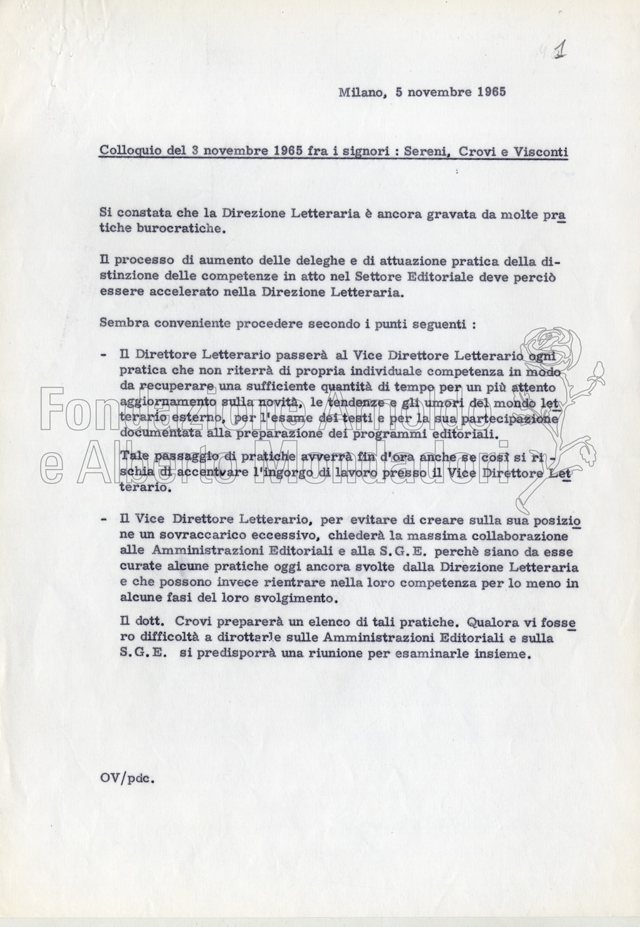 Il nucleo più consistente è costituito dai fascicoli relativi a “Promemoria e programmi editoriali”, ognuno dei quali raccoglie documentazione organizzata per anno (1966 -1973). Si tratta di elenchi dss. con annotazioni mss., veline dss., appunti e comunicazioni dss. e lettere mss. Sono in gran parte relazioni e promemoria di Sereni alla Direzione della casa editrice, contrassegnate spesso come carte “riservatissime”, in cui viene fatto il punto della situazione sugli autori, le collane ecc., ma soprattutto vengono elaborate proposte ed espresse opinioni su questioni di strategia editoriale.