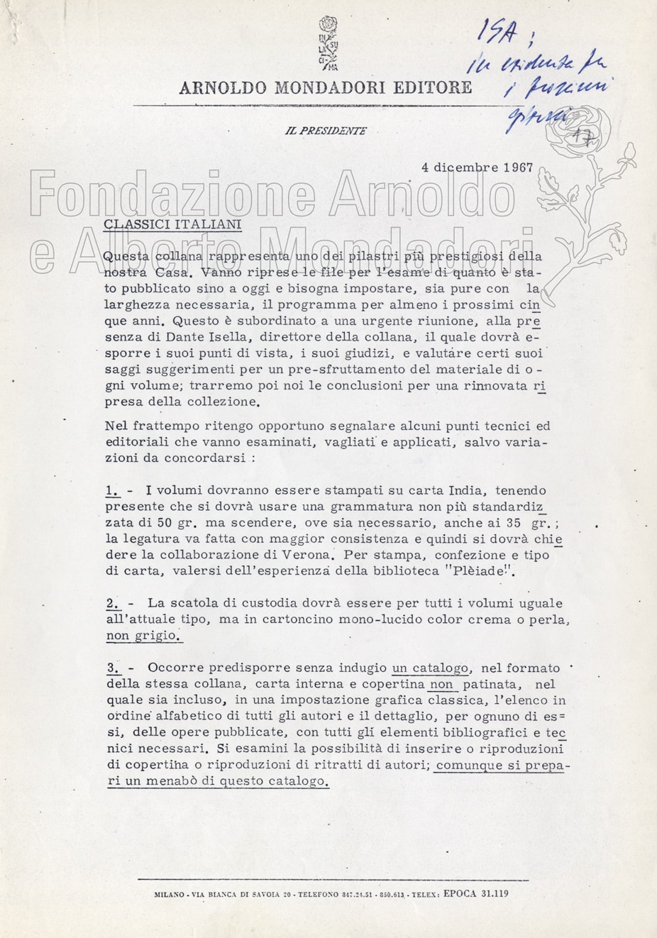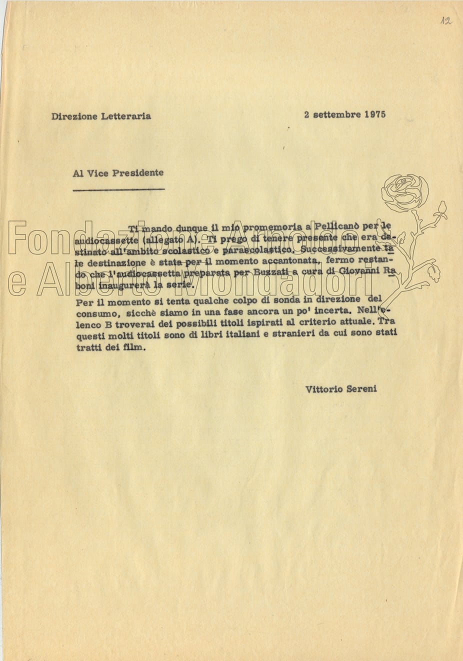 Il nucleo più consistente è costituito dai fascicoli relativi a “Promemoria e programmi editoriali”, ognuno dei quali raccoglie documentazione organizzata per anno (1966 -1973). Si tratta di elenchi dss. con annotazioni mss., veline dss., appunti e comunicazioni dss. e lettere mss. Sono in gran parte relazioni e promemoria di Sereni alla Direzione della casa editrice, contrassegnate spesso come carte “riservatissime”, in cui viene fatto il punto della situazione sugli autori, le collane ecc., ma soprattutto vengono elaborate proposte ed espresse opinioni su questioni di strategia editoriale.