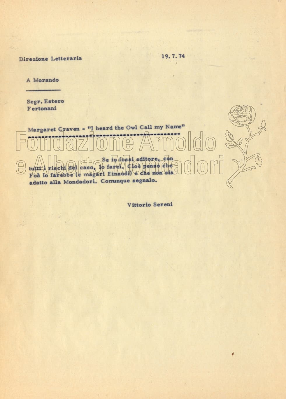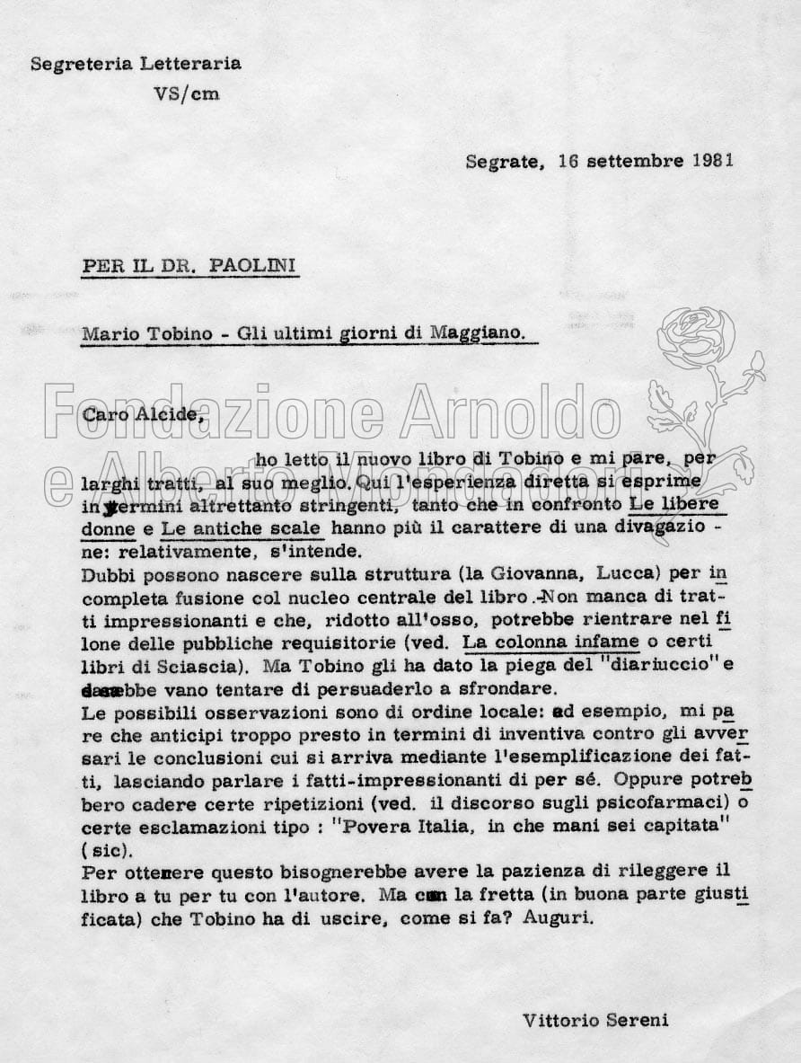 Si tratta in prevalenza di veline dss. e moduli aziendali. I fascicoli relativi ai giudizi editoriali su testi di narrativa e poesia appartengono in maggior parte agli anni Settanta, e comprendono brevi note di Sereni redatte sulla base di letture di altri: nettamente prevalenti, per quanto riguarda i testi stranieri, i giudizi sulla narrativa. Nel complesso delle carte poi, tra le letture da lui condotte personalmente sono molto più numerose quelle sui testi italiani, concentrate soprattutto nel periodo della sua consulenza.