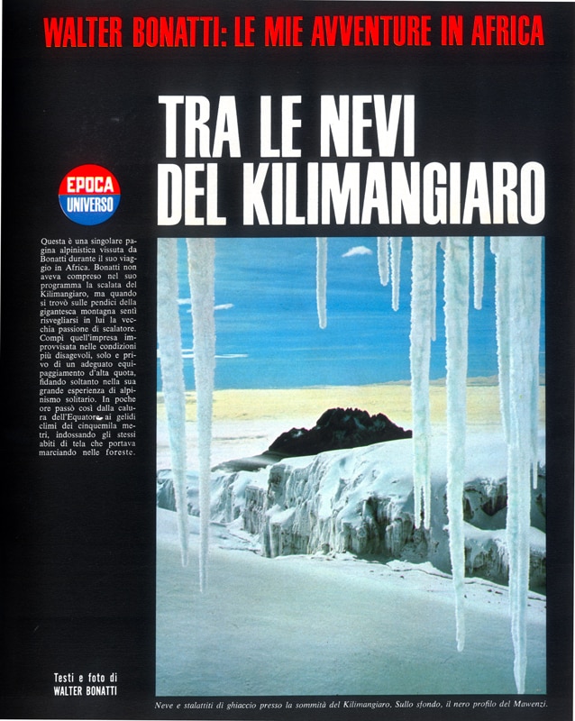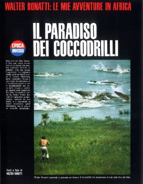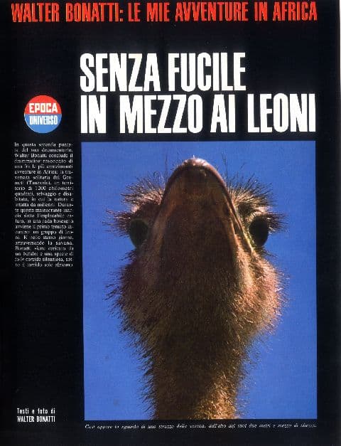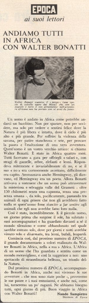Nel numero del 12 febbraio 1967, «Epoca» annuncia ai suoi lettori un grande documentario a colori, quasi fosse un racconto di avventure: Andiamo tutti in Africa con Walter Bonatti. Così inizia la presentazione: «Un uomo è andato in Africa come un bambino. Non per sparare, non per uccidere, ma solo per vedere e sentirsi felice dove la Natura è più libera e intatta, dove il cielo è più alto e grande». Nell’Africa Orientale, nella regione dei Grumeti in Tanzania ha inizio l’avventura tra foreste, deserti, savane, leoni, coccodrilli, una scalata fuori programma del Kilimangiaro. La fine del viaggio tra i «Gladiatori vestiti di rosso», i Masai. Quando Bonatti lascia il villaggio, gli anziani gli tendono la mano e i giovani chinano il capo, aspettandosi il rituale saluto da colui che i loro padri avevano definito Muzùngu Muzùri, l’uomo bianco buono.